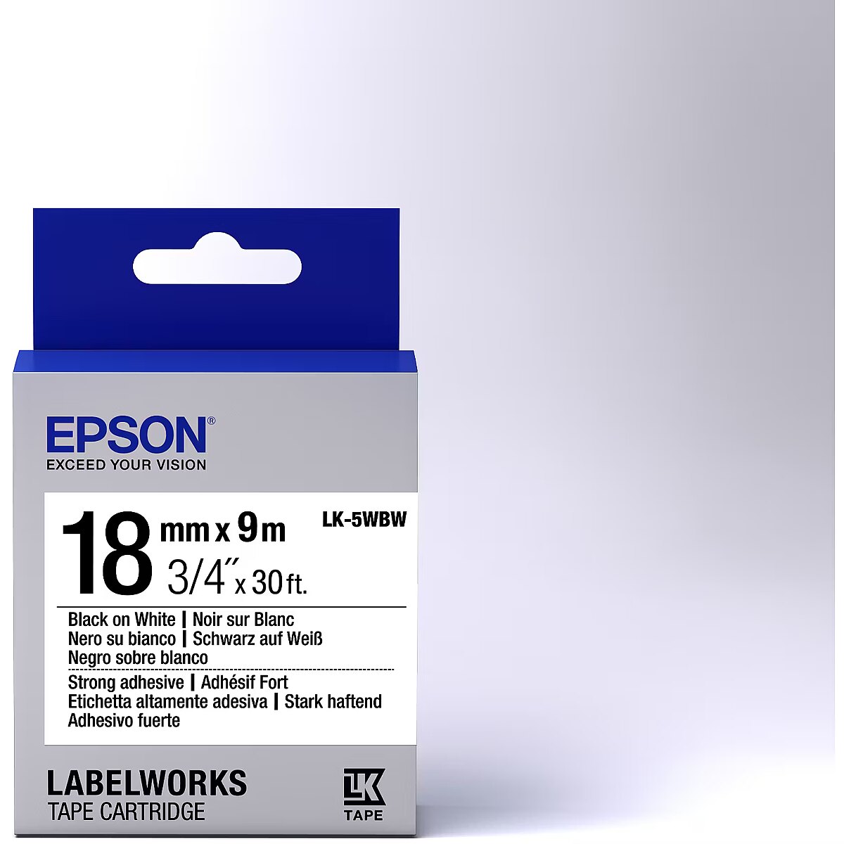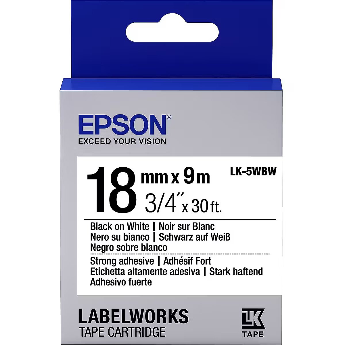 ShortSummaryDescription - Epson Label Cartridge Strong Adhesive LK-5WBW Black/White 18mm (9m), Black on white, Japan, LabelWorks LW-1000P LabelWorks LW-400 LabelWorks LW-400VP LabelWorks LW-600P LabelWorks LW-700..., 1.8 cm, 9 m, 1 pc(s)