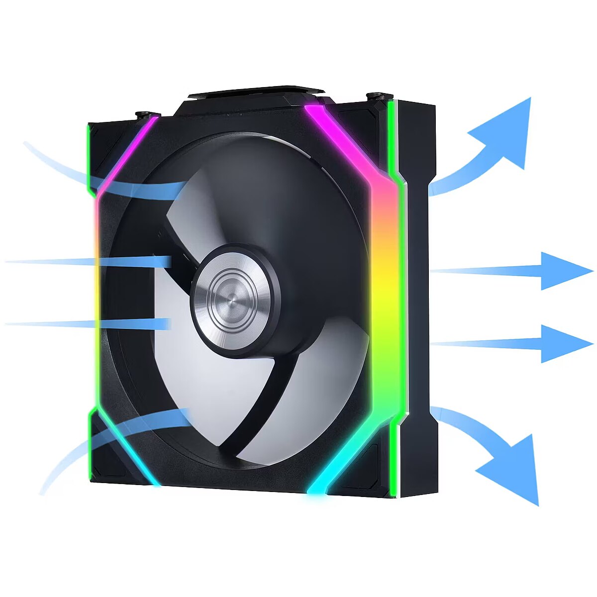 Summary - Lian Li UNI FAN SL Wireless 120. Type: Fan, Fan diameter: 12 cm, Maximum air pressure: 2.44 mmH2O, Bearing type: Fluid Dynamic Bearing (FDB). Voltage: 5 - 12 V. Product colour: Black