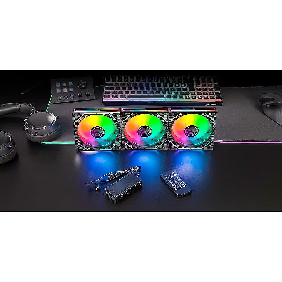 LongDesc - ARGB Fan Kit MF-3DPROKITThe MF-3DPROKIT fan kit combines cutting-edge design, performance, and advanced customization with 360º Infinity Mirror 3D lighting and a dynamic ARGB frame. Equipped with 120mm FDB-bearing fans, it ensures whisper-quiet, long-lasting operation. The ARGB hub supports up to 10 fans, and the RF remote control allows real-time speed and lighting adjustments. Compatible with ASUS AURA Sync, Mystic Light Sync, and RGB Fusion, it seamlessly integrates into any gaming setup.Infinity Mirror 3D LightingThe MF-3DPROKIT takes cooling aesthetics to the next level with its stunning 3D Infinity Mirror design. This set of three 120mm FDB-bearing fans not only ensures silent and reliable performance but also enhances your setup with immersive ARGB lighting. Featuring a dynamic frame with two LED strips and Infinity Mirror effects on both the core and edges, this fan kit creates an impressive visual impact, pushing your PC customization to the next level.Silence and Durability with FDB BearingsBuilt for optimal performance, the MF-3DPROKIT fans incorporate Fluid Dynamic Bearings (FDB), significantly reducing friction and wear for ultra-quiet, stable, and long-lasting operation.PWM Speed Control SystemThe advanced PWM control maximizes cooling efficiency with an adjustable speed range from 600 to 1600 RPM. This feature dynamically adjusts fan speeds based on system demand, ensuring the perfect balance between airflow and noise reduction, keeping temperatures stable even during intense gaming sessions.RF Remote Control & ARGB HubTake full control of your cooling and lighting setup in seconds. With the included RF remote, you can instantly adjust ARGB effects and fan speed, without the need for software. Switch between effects, optimize cooling as needed, and create the perfect ambiance effortlessly. Additionally, the included ARGB hub allows you to connect and sync up to 10 fans, unlocking unparalleled customization and performance.Full ARGB CompatibilityThe MF-3DPROKIT is fully compatible with ARGB controllers and motherboards, including ASUS AURA Sync, Mystic Light Sync, and RGB Fusion, ensuring seamless integration with your entire setup’s lighting effects.
