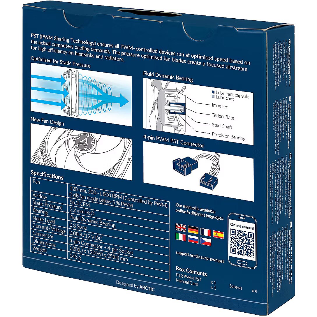 LongSummaryDescription - ARCTIC P12 PWM PST (Black/Black) Pressure-optimised 120 mm Fan with PWM PST. Type: Fan, Fan diameter: 12 cm, Rotational speed (min): 200 RPM, Rotational speed (max): 1800 RPM, Noise level: 0.3 sone, Airflow: 95.65 m³/h, Maximum air pressure: 2.2 mmH2O, Bearing type: Fluid Dynamic Bearing (FDB). Voltage: 12 V. Width: 120 mm, Depth: 120 mm, Height: 25 mm. Product colour: Black
