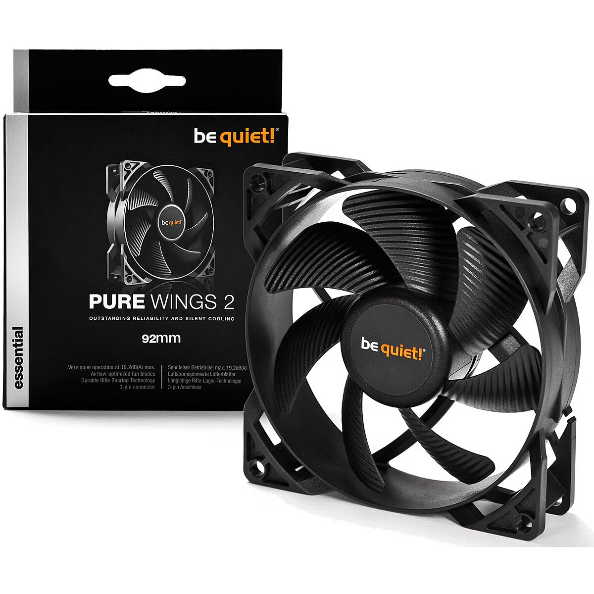 Technical_details - Pure Wings 2 – Outstanding Reliability and Silent Cooling. The Pure Wings 2 92mm fans bring famous be quiet! silent cooling to entry level computing, yet are also appropriate for gaming and multimedia systems. The most important Featuress include: - Nine airflow-optimized fan blades that reduce noise-generating turbulence.