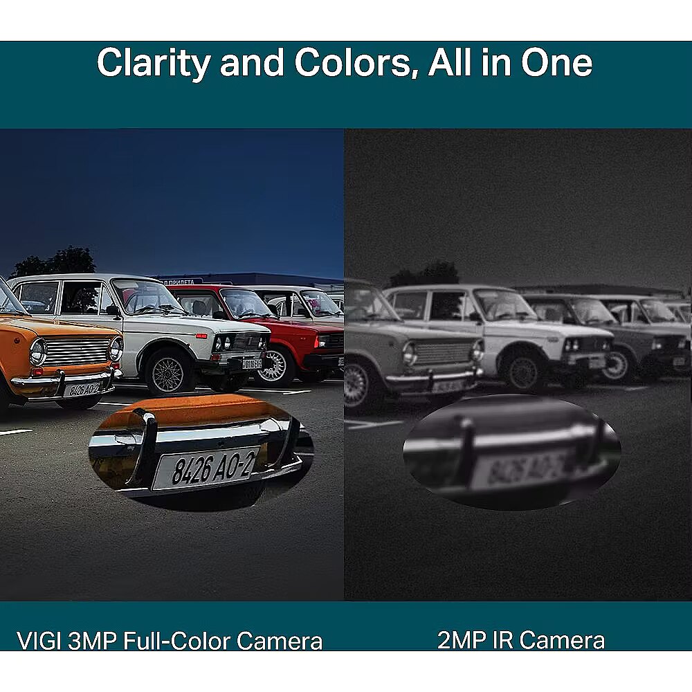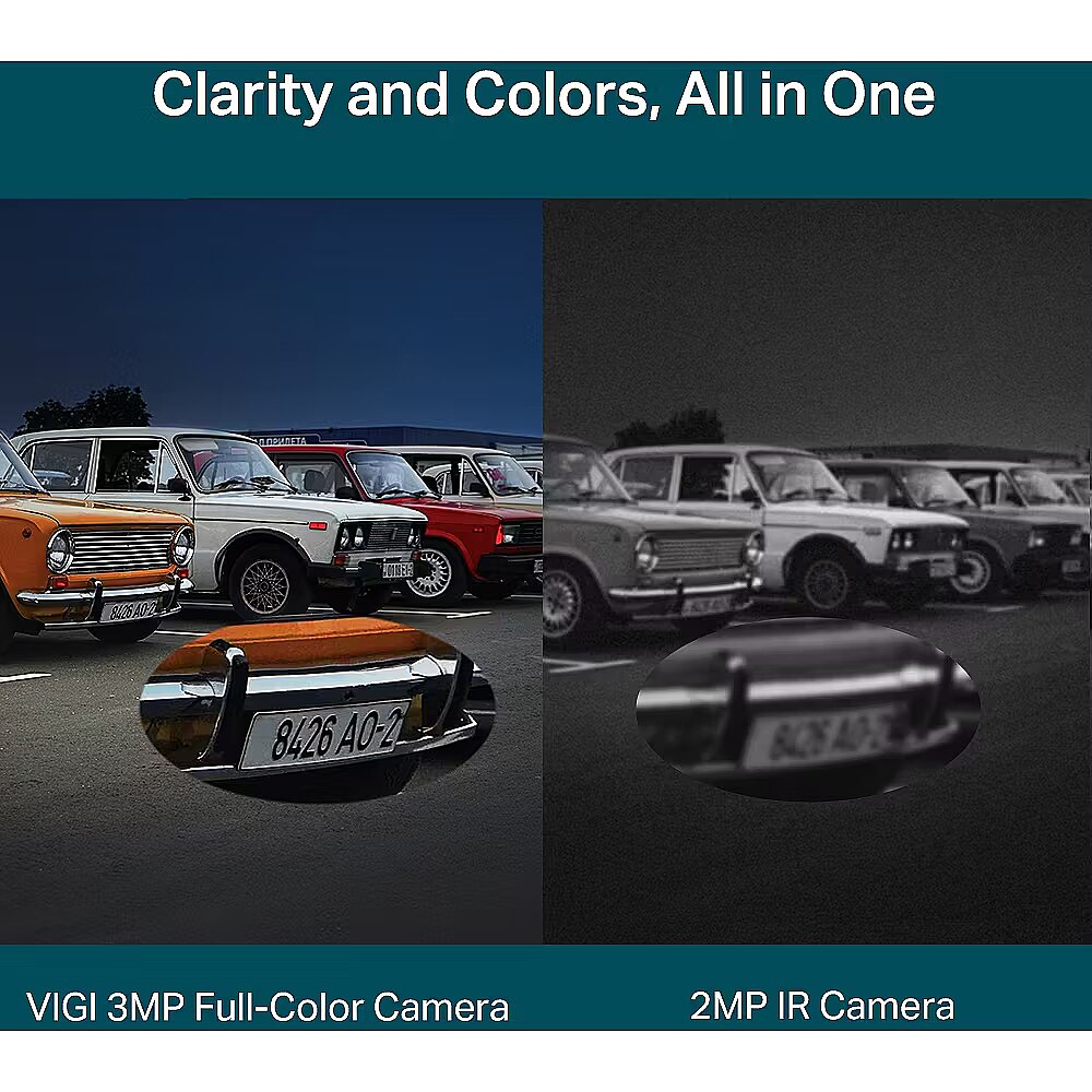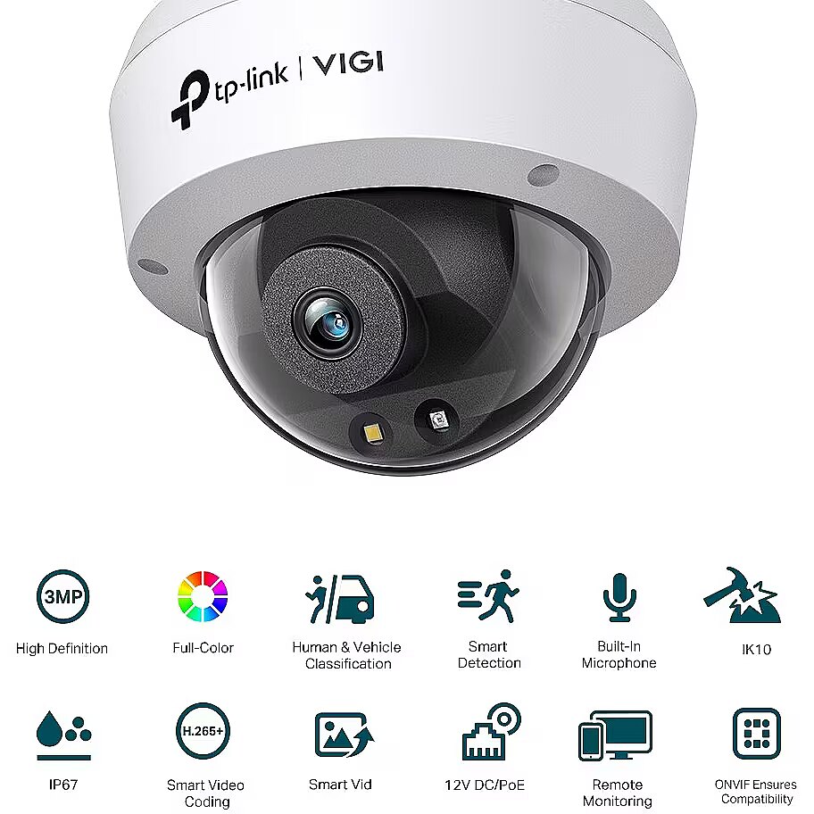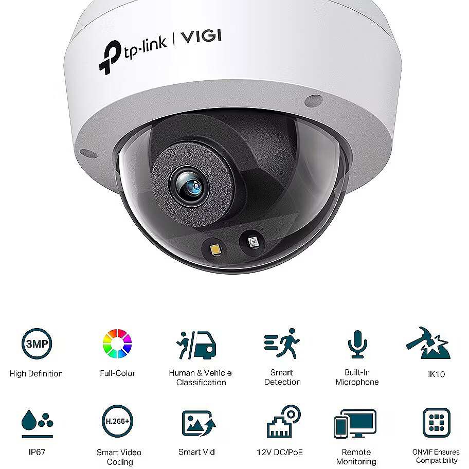 LongDesc - All The Colors, All The Time3MP Full-Color Dome Network CameraClarity and Colors, All in OneMonitor 24-hour clear and colorful details even in pitch dark night. VIGI Full-Color camera provides maximum 3MP resolutions and ensures colorful monitoring with its large-aperture lens, high-sensitivity sensor, and attached supplemental lights.Human & Vehicle ClassificationIntegrated AI chips support advanced algorithms to distinguish humans and vehicles from other objects. You can flexibly customize alarm rules to match your monitoring needs and receive more accurate event notifications.We keep an eye on your business.Smart DetectionBacked by AI algorithms, the VIGI camera offers more smart detection. You will receive notifications when someone crosses a boundary, enters an area you've set, obstructs the camera, or removes/abandons objects.No more silent surveillance.Built-In MicrophoneThe VIGI camera features a built-in microphone to record anything going on within a 15-ft radius of the camera. This gives you more detailed monitoring for greater peace of mind.IK10 Vandal-Proof & IP67 WaterproofWith vandal-resistant, rugged housing and waterproof design, this VIGI dome camera is built tough to withstand vandalism and harsh environments with rain and dust for constant security anywhere and anytime.More compression. More savings. Same quality.Without using any extra bandwidth, your cameras transmit compressed crystal-clear video to save disk space, ease network loads, and reduce monitoring costs without sacrificing image quality.Never miss a detail.SmartVid-Smart Video EnhancementVIGI’s professional technologies process videos to greatly improve their quality that is vital to your monitoring, including Smart IR, WDR, 3D DNR, and Night Vision.Discover the best way to power your camera.PoE/12V DCTwo power supply ways not only give you more convenience but also make your wiring remarkably easy.Flexible ManagementTake full control over your security via four management methods: the web UI, NVR UI, VIGI app, and VIGI Security Manger. Flexible Installation Gives You More Convenience.Easily route your camera’s cable into a dropped ceiling or avoid drilling by slotting it through the camera’s side outlet.One system. Full security.Run your business with peace of mind.The VIGI professional surveillance system by TP-Link is dedicated to protecting the business you’ve worked hard to build — whenever, wherever. Our outstanding functions, reliable quality guarantees, and simplified installation work together to ensure your business stays safe and sound.