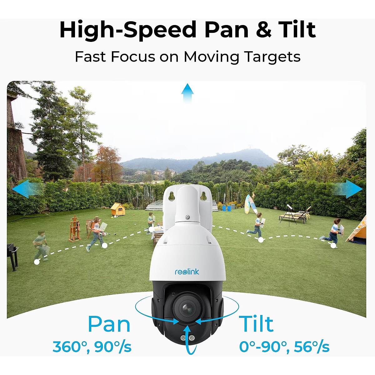 LongDesc - 360° Coverage. Dead-Zone Free.Let the camera be your eye in the sky to cover every inch. With high-speed 360° pan and 90° tilt capabilities, P840 provides all-around coverage within only 4 seconds and ensures that no corner goes unseen, be it your yard, driveway, or even the block.Immersive 4K, Day and Night.Capture stunning detailed footage that's four times sharper than HD, whether it's the bright daylight or the darkness of night. As night descends, select the ideal night vision mode that suits your preferences: the color night vision powered by spotlights or the black & white night vision powered by IR LEDs.Drag to Zoom in at 5XUnleash the smoothness of 5X optical zoom with the advanced 3D zoom technology. Whether you're zeroing in to see the finer points of scenes from afar, or expanding your view to cover a larger area, P840 lets you see more with just a swipe of your finger.Make Installation a BreezeThanks to Power over Ethernet (PoE) technology, this camera only requires one network cable to transmit both data and power, making installation quick and hassle-free.Flexible Options, Secured StorageKeep your memories safe and secure on a microSD card (up to 256GB) for convenient standalone access, or opt for the expanded storage of a Reolink NVR. With local storage, your footage is always within reach, ensuring easy accessibility and protection. And for added backup, the FTP server support has you covered.