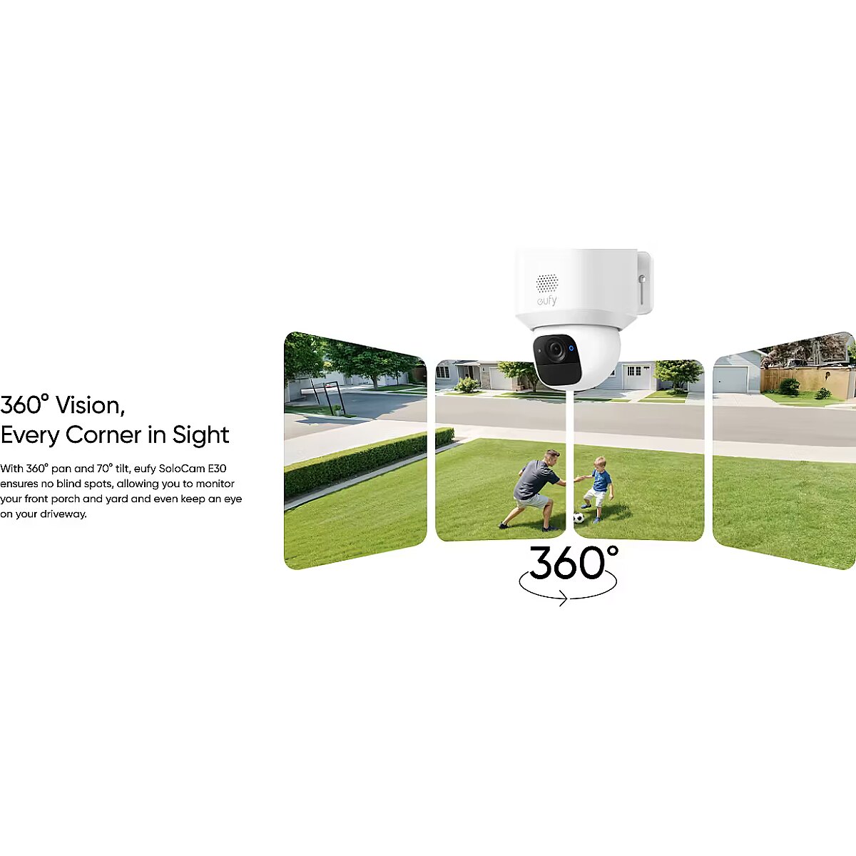 LongSummaryDescription - Eufy SoloCam E30. Type: IP security camera, Placement supported: Outdoor, Connectivity technology: Wireless. Mounting type: Wall, Product colour: White, Form factor: Dome. Field of view (FOV) angle: 360°, Tilt angle range: 0 - 70°, Pan range: 0 - 360°. LED type: IR. Maximum resolution: 2048 x 1080 pixels