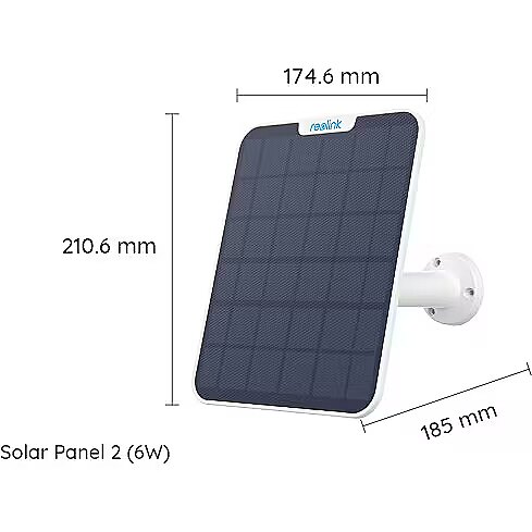 LongSummaryDescription - Reolink Solar Panel 2 akumulatora kamerai. Nominālā jauda: 6 W, USB izejas spriegums: 6 V, USB izejas strāva: 0,96 A. Starptautiskais aizsardzības (IP) kods: IP65, USB savienotāja tips: Iepakojuma platums: 200 mm, Iepakojuma dziļums: 240 mm, Iepakojuma augstums: 85 mm. Platums: 174,6 mm, dziļums: 185 mm, augstums: 210,6 mm.