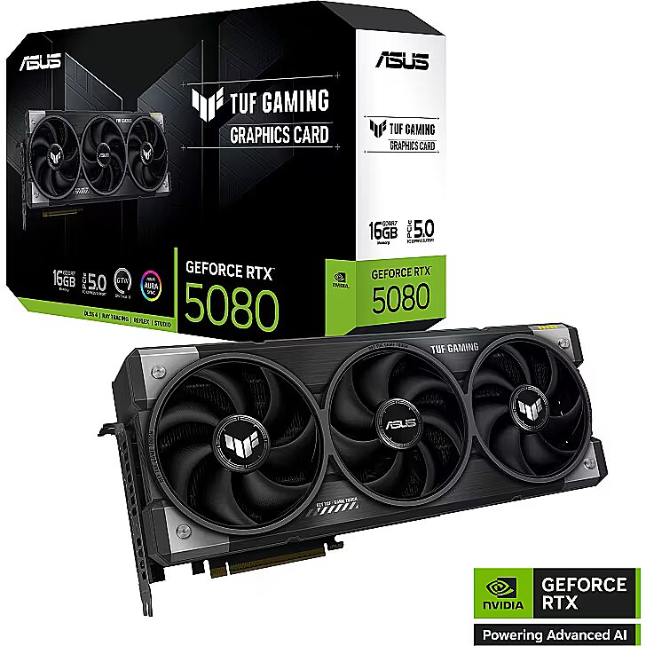 LongDesc - Game TUF. Built to Last.ASUS TUF Gaming GeForce RTX™ 5080NVIDIA Blackwell architecture is elevated by enhanced cooling and power delivery, fortified with rugged reinforcements for exceptional durability. Lock, load and dominate with the TUF Gaming GeForce RTX™ 5080, designed to withstand the harshest conditions and deliver unparalleled performance.Military-Grade ComponentsTUF Chokes & MOSFETsCertified military-grade TUF chokes and MOSFETs deliver rock-solid power to the GPU, which can help improve system stability.TUF CapacitorsTUF 5K black metallic capacitors provide 52% wider temperature tolerance and a 2.5X longer lifespan than standard capacitors.Phase-Change GPU Thermal PadBy melting to effectively fill the gaps between the GPU and the thermal module, a premium phase-change GPU thermal pad provides superior thermal conductivity and enhanced heat dissipation, ensuring optimal performance and longevity for graphics cards under heavy loads.Protective PCB CoatingA protective conformal coating envelops the circuit board to help protect against short-circuits caused by moisture, dust or debris.Dual-ball Fan BearingsDual-ball bearings offer an extensive lifespan of up to 80,000 hours, double the longevity of sleeve bearings and surpassing fluid dynamic bearings. This helps ensure long-lasting, reliable and quiet cooling.