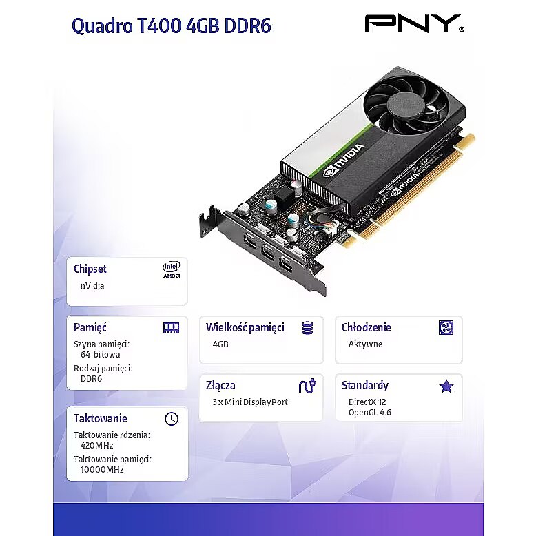 ProductDescription - PNY GPU NVIDIA T400 4GB GDDR6 64bit, 1.094 TFLOPS, 30W, 3x mDP, Low Profile, 1 fan, 1 slot