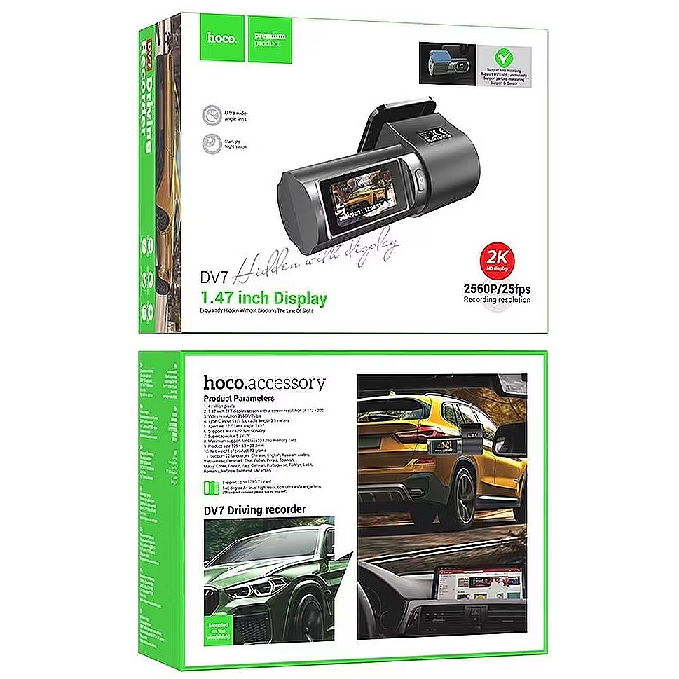 description_en - Hoco DV7 car camera with Lingtong GP2178 + SC4336 sensor with a resolution of 4 million pixels, which records video in 2K resolution at 30 frames per second, which allows for smooth and bright recordings. The built-in 1.47” TFT display allows you to constantly monitor the situation around the vehicle, and the F2.0 aperture and wide viewing angle of 140° will provide a bright and wide field of view.
