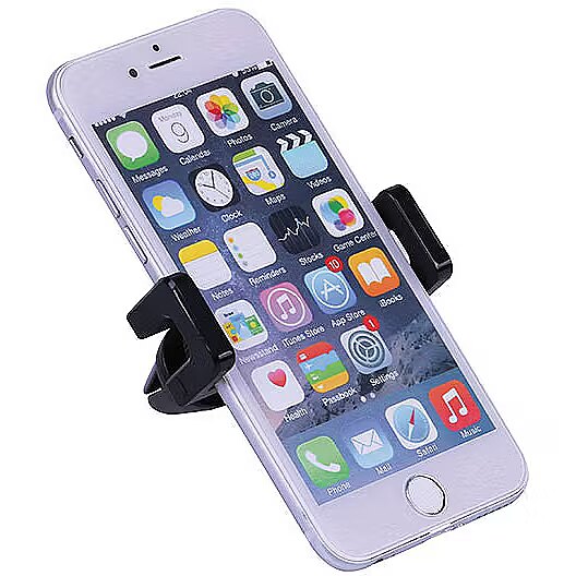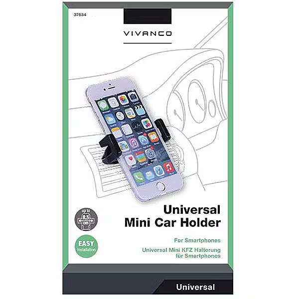 description_en - Universal mobile receptacle for the car to be fixed at the ventilation shaft. Car holder for smartphones Fixed to the ventilation shaft Easy installation Width adjustable Suitable for smartphones up to 8.5 cm No limitation of vision field