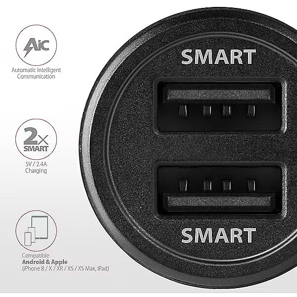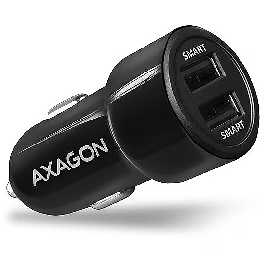 LongDesc - Dual AXAGON PWC-5V5 car USB charger to charge up to two mobile devices at a time.With a total power of 24W, the charger recharges mobile phones and tablets at the same speed as the mains USB power adapter.Two USB SMART 5V/2.4A oututs allow charging of most mobile devices.It is compatible with Apple iPhone, iPad, iPod, and Android phone and tablet charging standards.The AIC function recognizes the connected device and automatically selects the optimal charging speed, while the CV/CC function ensures steady course of charging.The advanced protection system at the charging adapter output protects the device being charged from damage.The car charger indicates the correct input power with a blue LED built inside, its light does not dazzle and does not distract you while driving.The body of the power adapter has a pleasant shape and size, so it can be easily removed from the car cigarette lighter socket.Input:• input voltage DC 12 V - 24 V (WIV function), supports both passenger cars and trucks• standard CL input - car cigarette lighter socketOutputs:• two outputs• 2x USB type A port: SMART: Smart Charging - 5V/2.4A and standard 5V charging• support for simultaneous charging from both outputs• total maximum power 24W, total maximum current 4.8A The charger charges devices with the following technologies:• Standard charging of all devices that support 5 V and Apple iPhone 5, 6, SE, 7 charging.• SMART 5V/2.4A charging, Qualcomm Quick Charge 1.0, USB Battery Charging 1.2 and quick charging of Apple iPhone 8, X, XR, XS, XS Max and iPads.The charger supports WIV, AIC, and CV/CC functions:• Wide Input Voltage - function of a wide range of input voltage; it protects the adapter against undervoltage and overvoltage at the input and enables automatic detection of 12V or 24V on-board distribution.• Automatic Intelligent Communication - function of automatic recognition of the connected device to select optimal charging parameters.• Constant Output Voltage / Constant Output Current - the constant voltage and constant current hold function prevents the output power fluctuations; this function ensures steady course of charging.Complex output protection: OCP, OVP, OTP, OSP:• Over Current Protection - protection of output against current overload.• Over Voltage Protection - protection against overvoltage at the output.• Over Temperature Protection - protection against overheating of the adapter.• Output Short Circuit protection - short circuit protection at the output.Other features:• Decently shining through blue LED indicates the input voltage connection,• Dimensions: depth 59 mm, diameter 28 mm,• Weight: 20 g,• Material: non-flammable plastic.Package contains:• dual car charger,• multilingual manual ENG/CZ/DE/ESP/FR/HU/IT/PL/RO/RU/SK/BG,• packed in a cardboard box with a visibly presented product.