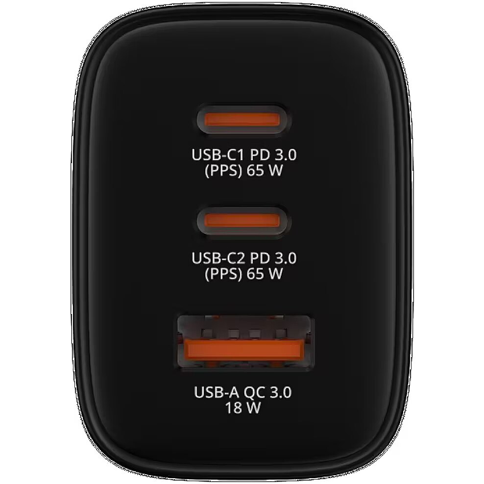 Technical Specifications: Output Power: up to 65 W total Output Ports: USB-C1: 3.3–11V⎓3A / 5V⎓3A / 9V⎓3A / 12V⎓3A / 15V⎓3A / 20V⎓3.25A (max. 65W) USB-C2: 3.3–11V⎓3A / 5V⎓3A / 9V⎓3A / 12V⎓3A / 15V⎓3A / 20V⎓3.25A (max. 65W) USB-A: 4.5V⎓5A / 5V⎓4.5A / 9V⎓3A / 12V⎓2.5A / 20V⎓1.5A (max. 30W) Input: 100–240V AC, 50/60Hz, 1.5A max. Supported Technologies: Power Delivery 3.0, PPS, Quick Charge 3.0 Safety Features: overload, short-circuit, overvoltage, and overheating protection Additional Features: foldable plug, compact design