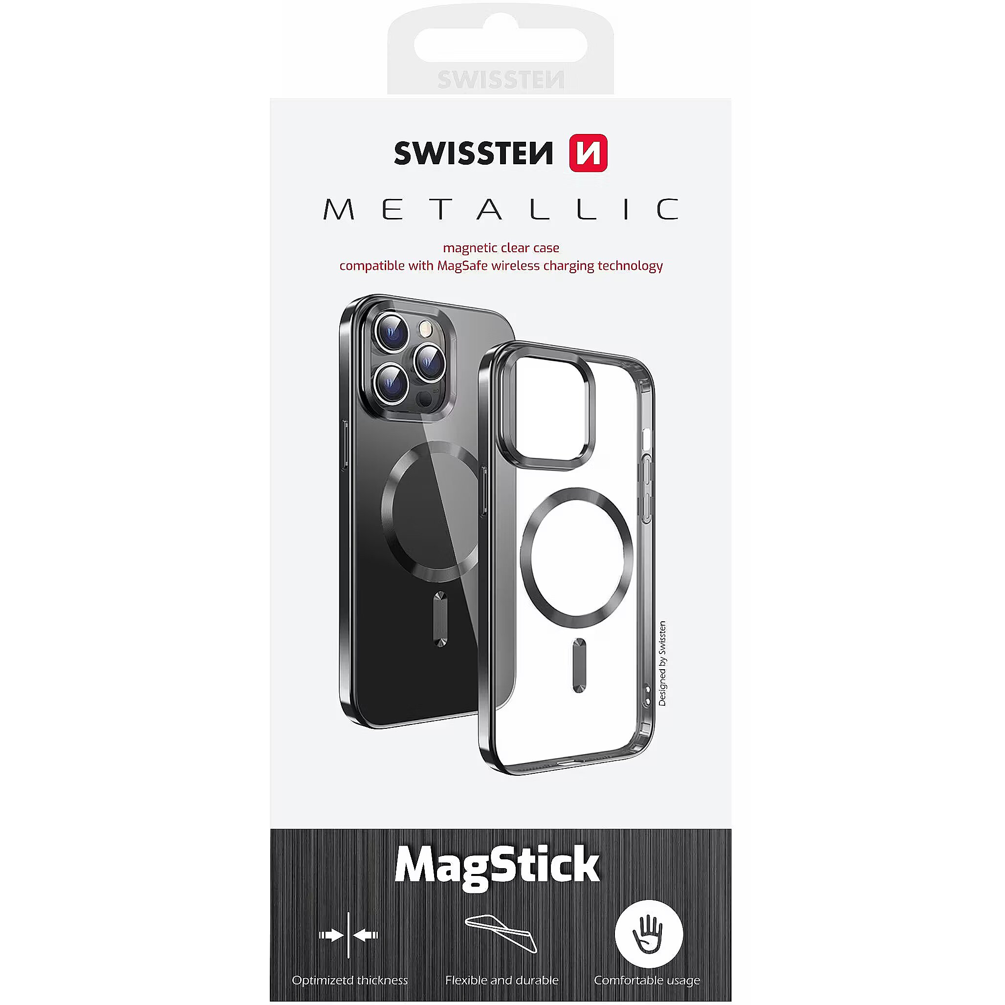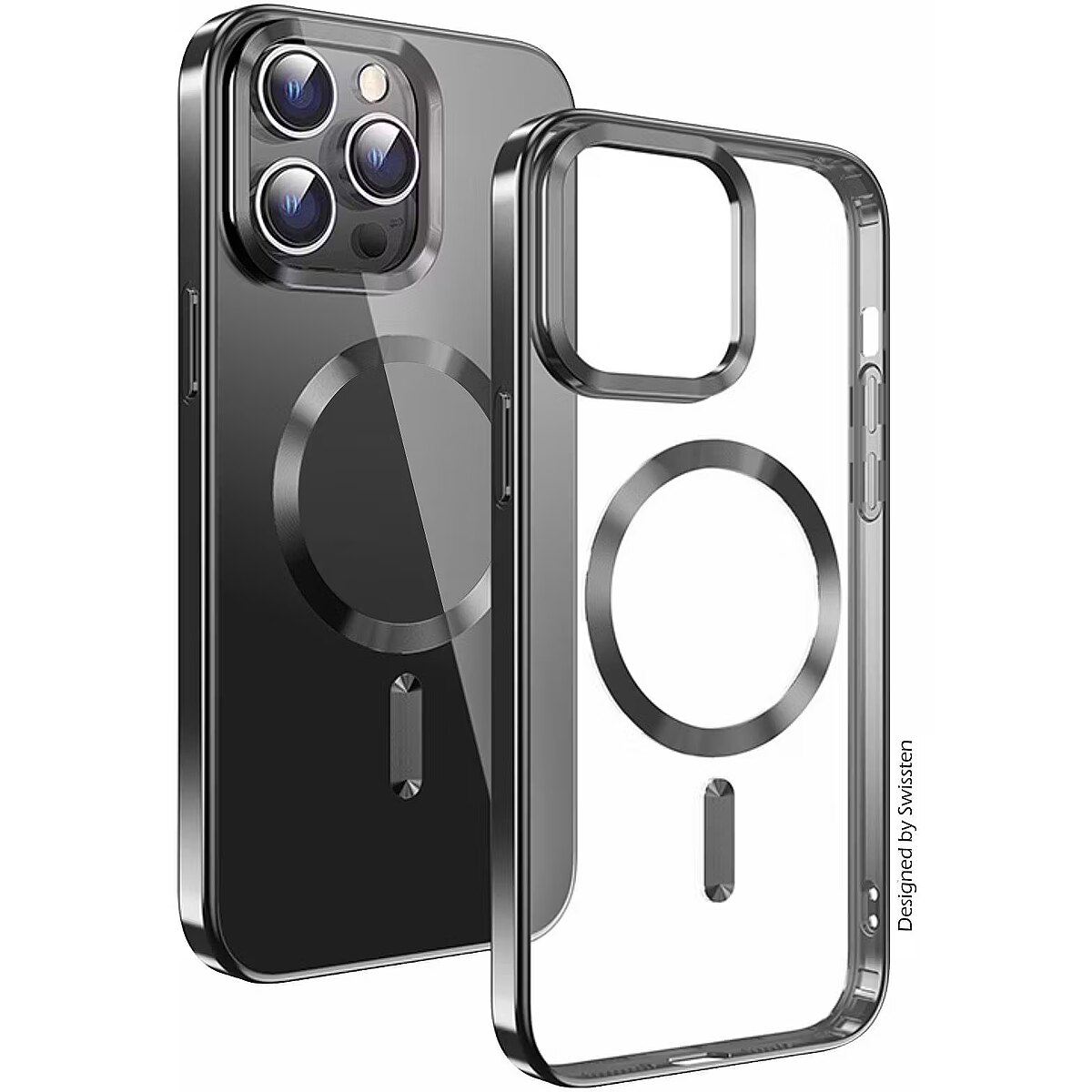 description_en - Luxury transparent metal case SWISSTEN Mag Stick with elegant black frame and metal accessories. Suitable for charging MagSafe. MagSafe