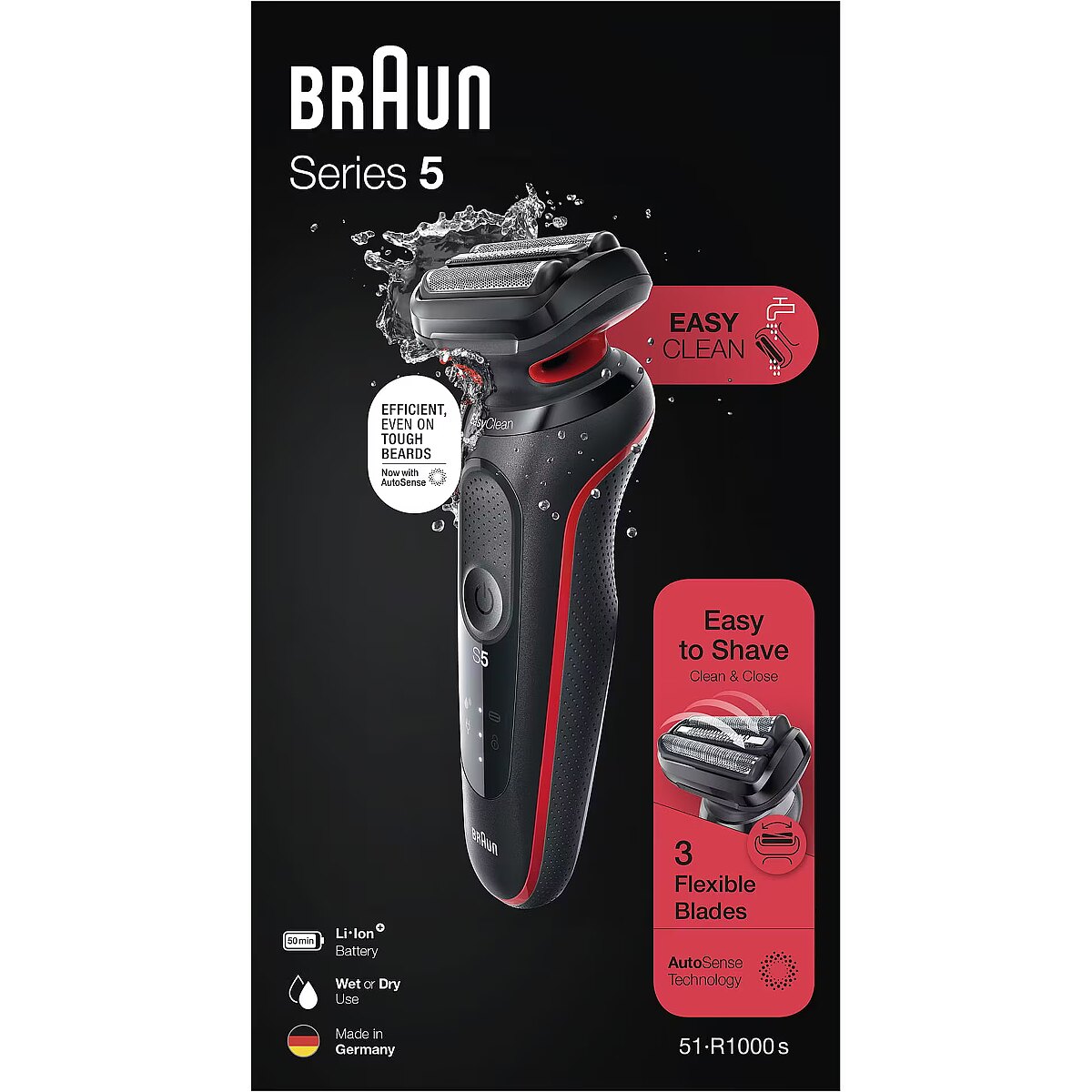 LongSummaryDescription - Braun Series 5 50-R1000s. Shaver system: Foil shaver, Product colour: Black, Red, Shaving system technologies: AutoSense. Power source: Battery, Battery technology: Lithium-Ion (Li-Ion), Battery type: Built-in battery. Package type: Box. Quantity per pack: 1 pc(s). Handle(s) features: Soft grip