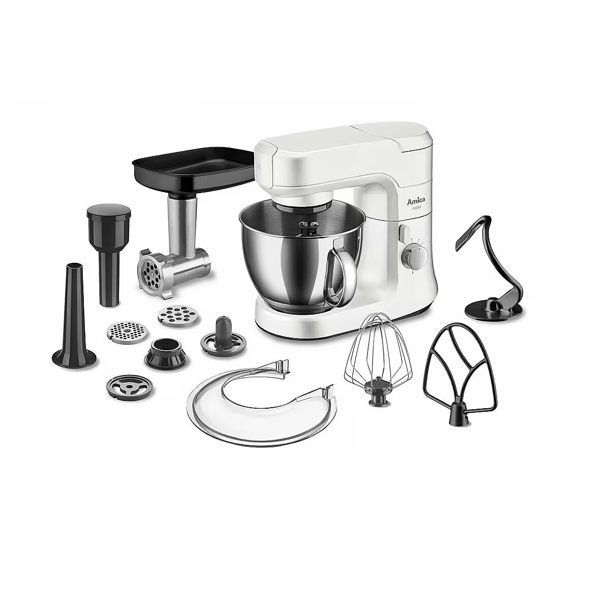 Accessories included - Maszynka do mielenia Nasadka masarska Nasadka kebbe Misa 4,5 l ze stali szlachetnej z osĹonÄ Wyjmowana tacka ociekowa Rodzaje mieszadeĹ: mieszadĹo, trzepaczka, hak