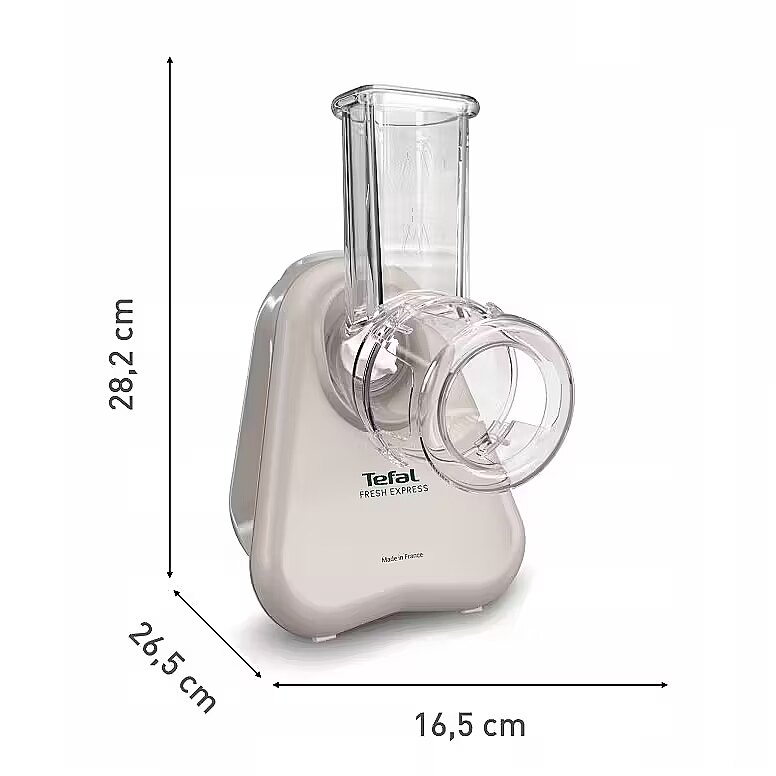 MediumApraksts LV - Padariet ikdienas ēdiena gatavošanu vieglāku! Elektriskais dārzeņu smalcinātājs Fresh Express 3-in-1 spēj visu - no gardiem svaigiem salātiem līdz dārzeņu gratīniem, čipsiem un citām garšīgām receptēm! Sasmalciniet, sarīvējiet un sagrieziet šķēlēs visas iecienītākās sastāvdaļas ar gudru tiešās padeves sistēmu, kas ēdienu sagriež tieši traukā - mazāk darba un mazāk tīrīšanas. Ēdiena gatavošana vēl nekad nav bijusi vieglāka! - Viedā tiešās padeves sistēma sagriež sastāvdaļas tieši bļodā, lai padarītu darbu vienkāršāku un mazāk tīrīšanas - 3 funkcijas 1: plāni sasmalciniet burkānus, sagrieziet sīpolus, sarīvējiet parmezānu un vēl daudz ko citu - to visu ar vienu elektrisko pārtikas smalcinātāju - Izbaudiet vairāk dārzeņu: Īpaši izstrādāts, lai viegli sagrieztu šķēlēs, sasmalcinātu vai sagrieztu augļus, dārzeņus un sieru - lielisks veids, kā ikdienā baudīt vairāk dārzeņu - Viegli uzglabāt: Īpaši kompaktais izmērs ir piemērots jebkuram skapim, bet atjautīgā uzglabāšanas sistēmā konusi un vads atrodas tieši ierīcē - Drošs: Viedā ventilācijas gaisa plūsmas sistēma ar īpašu spraugu novērš motora pārkaršanu - Viegli tīrāms: Elektriskā dārzeņu smalcinātāja piederumi, ko var mazgāt trauku mazgājamā mašīnā, atvieglo tīrīšanu - Izstrādāts un ražots Tefal rūpnīcā Lurdā, Francijā, ievērojot visaugstākos kvalitātes un kompetences standartus - 15 gadu remonta iespēja