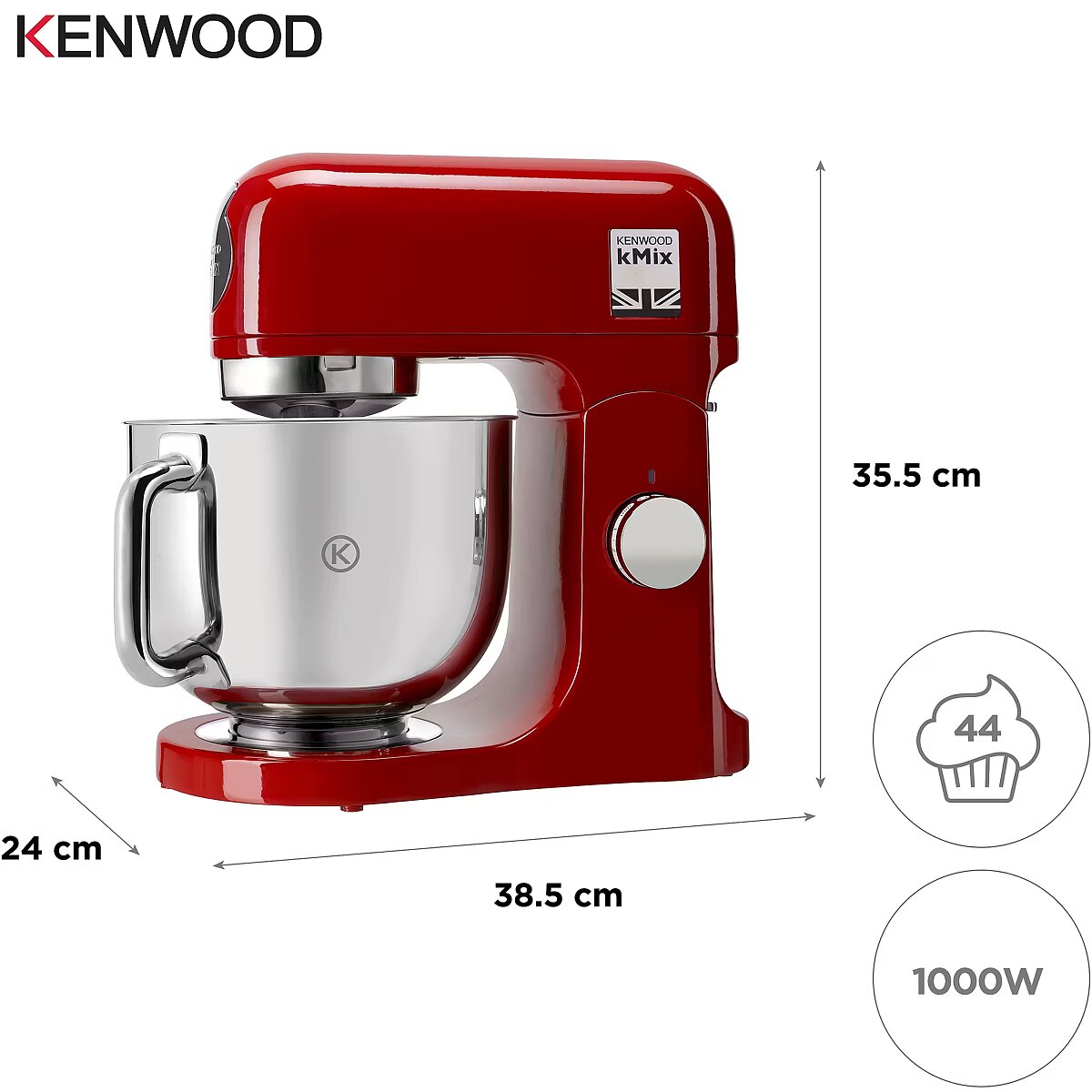 LongSummaryDescription - Kenwood kMix. Bowl capacity: 5 L, Product colour: Red, Control type: Rotary. Bowl material: Stainless steel, Housing material: Metal, Stainless steel. Power: 1000 W. Width: 385 mm, Depth: 240 mm, Height: 355 mm. Package width: 298 mm, Package depth: 450 mm, Package height: 463 mm