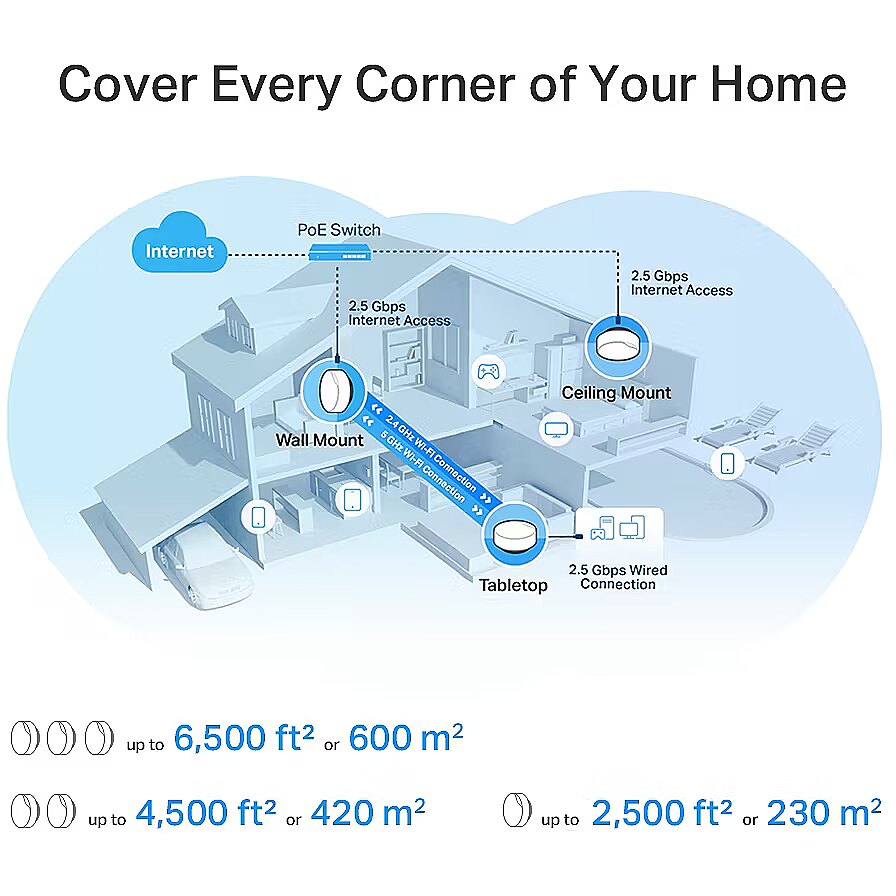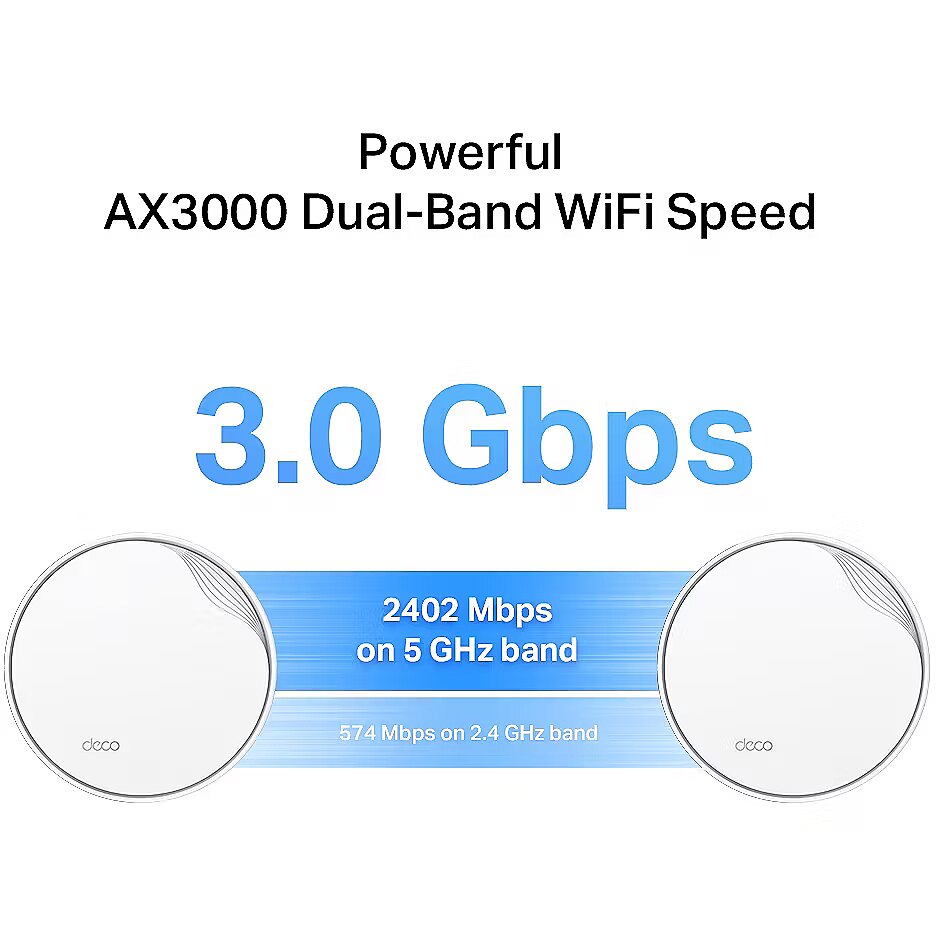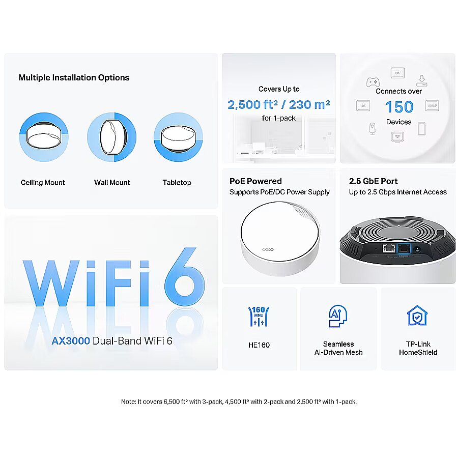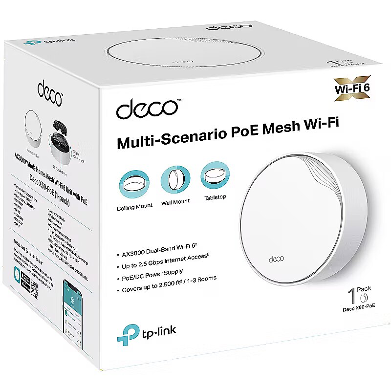 LongDesc - Multi-Scenario Mesh WiFi Meets All Your NeedsAX3000 Whole Home Mesh WiFi 6 System with PoEMultiple Installation Options,Put Your Deco Anywhere You WantDeco X50-PoE has flexible installation to meet various demand scenarios. Place it on a tabletop or install it on a ceiling or wall with our adaptive accessories.Ideal for Non-Stop EntertainmentsArmed with WiFi 6 technology, Deco whole home mesh WiFi is designed to deliver a huge boost in coverage, speed, and total capacity. Get on the latest mesh WiFi to enjoy the future network that loads faster and connects more.Powerful AX3000 Dual-Band WiFi SpeedThe latest 1024-QAM boosts speeds up to 3.0 Gbps — ideal for bandwidth-intensive tasks like cloud gaming and 8K video. Families will enjoy immersive live-streaming with flawless video and clear audio without buffering.Multi-Gig 2.5 Gbps PoE PortArmed with a 2.5 Gigabit Ethernet Port, Deco X50-PoE delivers exceptional multi-gigabit performance to support the insatiable demand for better and faster WiFi. Breakthrough the 1G bottleneck and drive your devices to peak performance. Or using 2.5 GbE port to enjoy blazing-fast wired connections.Power over Ethernet for Simplified Network DeploymentDeco X50-PoE is designed to use a single Ethernet cable for both data and power transmission. It also supports DC (power adapter included) power supply for flexible installations.No FussSimplify the installation and streamline the deployment—no need for electricians.Cost-EfficiencyNo need for additional cables and power adapters—reduce costs on infrastructure.FlexibilityMore placement options allow for deployment in complex environments.Cover Every Corner of Your HomeDeco units work together as a powerful mesh network to boost broader coverage for connections in every corner.Want more coverage? Simply add another Deco. All TP-Link Deco can work together.Engineered for More DevicesDeco products are aimed to dramatically improve capacity and efficiency in traffic-dense environments. No matter how many screens or devices are on at once, everyone is able to enjoy a more efficient network that loads faster without dragging down performance.Intelligent Networking for a Smarter HomeDeco uses its custom algorithms to automate the connections on your network, ensuring the strongest possible signals at all times.Seamless Roaming with One WiFi NameTP-Link Mesh means Deco units work together to form one unified network. Your phone or tablet automatically connects to the fastest Deco as you move through your home, creating a truly seamless WiFi experience.Whole Home CoverageEliminate weak signal areas throughout your houseSmart RoamingUninterrupted streaming when moving between roomsOne WiFi NameNo more switching WiFi network namesUnified ManagementControl your home WiFi by managing the central node via the Deco AppCompact Design, Easy to MountExceptional performance with compact design ensures simple WiFi installation while saving space. The elegant appearance makes Deco X50-PoE with a delicate body case makes it perfect to blend into various home decorations.Simple. Easy. Yet Powerful.Setup and manage your network anytime and anywhere on the user-friendly TP-Link Deco app. In just three easy steps your entire home can be blanketed in strong and reliable WiFi.Easy ManagementManage your WiFi at home or away on the Deco app. See every connected device, prioritize your own, and set up a guest network.Voice ControlUse an Amazon Alexa or Google Assistant-enabled device to control Deco X50-PoE with just your voice.All Decos Work TogetherDeco X50-PoE is compatible with every other Deco model to form a Mesh network. Expand Mesh WiFi coverage anytime by adding more Decos.