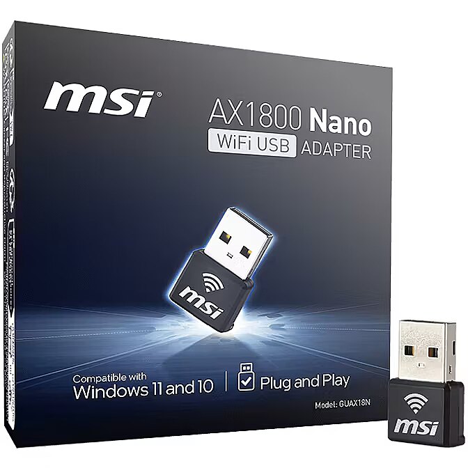 LongDesc - Upgrade to WiFi 6 instantlyThe MSI AX1800 Nano WiFi USB Adapter can boost your PC/laptop WiFi speeds up to 1201 Mbps on the 5GHz band and up to 574Mbps on the 2.4GHz band. With WiFi 6, latency and congestion are reduced in high density environments thanks to OFDMA and MU-MIMO technology that meets the needs for gaming and streaming connectivity.Compact sizeWith its compact size, the AX1800 Nano WiFi USB adapter is perfect for on-the-go connectivity.Easy to installThe AX1800 Nano WiFi USB adapter comes with a built-in driver. Users only need to insert it into a PC or laptop, then get WiFi with a few clicks.Better protectionThe MSI AX1800 Nano USB adapter utilizes WPA3 encryption, enhancing security and protecting your privacy from potential attacks.