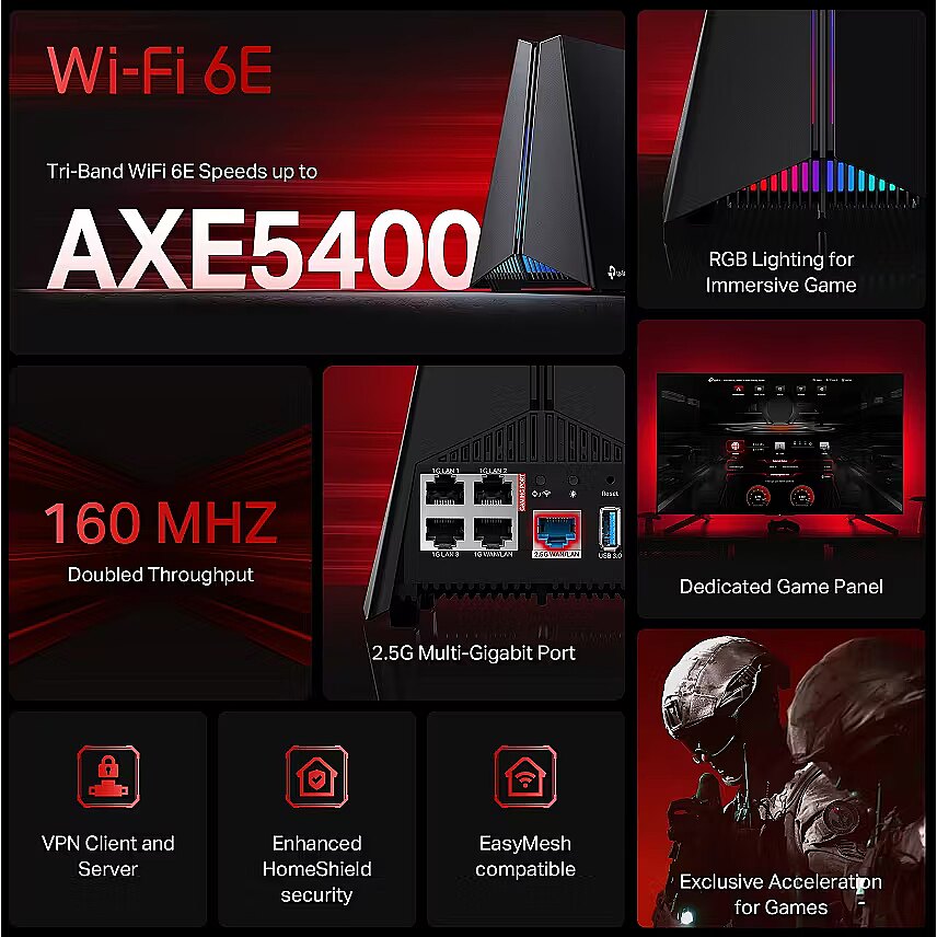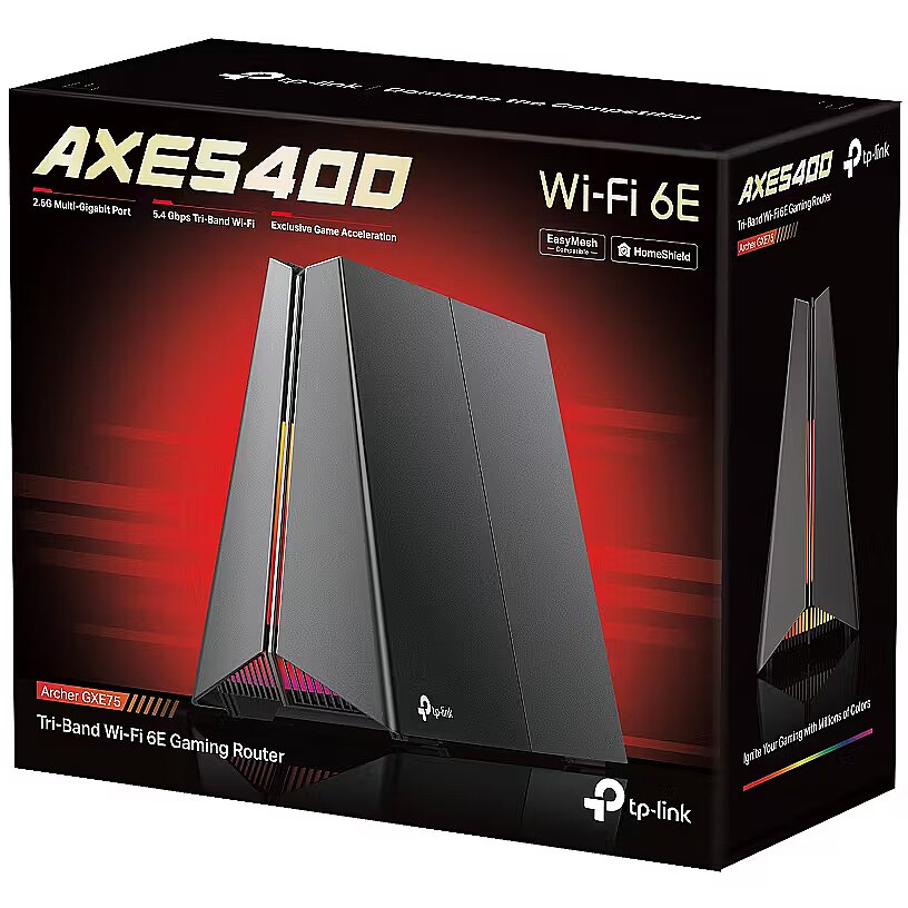 LongDesc - - 5.4 Gbps Tri-Band Wi-Fi: Up to 5.4 Gbps Tri-Band WiFi enables your devices always ready for the fiercest battles.The brand new 6 GHz band provides exceptional bandwidth and congestion-free channels exclusive to Wi-Fi 6E devices.†‡- 2.5G Multi-Gigabit Port: Supercharge your gaming network with the Archer GXE75 featuring a lightning-fast 2.5G WAN port and four 1G LAN ports for unrivaled speed and seamless multiplayer gaming.§- 4× Optimally Positioned Antennas: Enjoy uninterrupted gaming in every corner of your home with 4× optimally positioned antennas, proprietary Wi-Fi optimization, and Beamforming technology. - Exclusive Acceleration for Games: Accelerate game applications, game devices, mobile games, and game servers. Stabilize connections, minimize jitter, lag and ping while boosting speed.- Dedicated Game Panel: An intuitive game panel provides real-time insights into the battle environment, network status, router performance, rgb settings, accelerated games and gears, enabling players to strategize effectively.- Game-Style Design: High-performance launch pad appearance, seamless multicolor lighting, and optimized antenna layout ensure quality connections and a vibrant atmosphere.- TP-Link HomeShield: HomeShield provides robust antivirus protection for a secure gaming experience. It defends all your devices and personal data against online threats, ensuring peace of mind while gaming.△- EasyMesh Compatibility—Works with EasyMesh routers and range extenders to form seamless whole home Mesh WiFi. This connectivity ensures consistent coverage, allowing gamers to collaborate efficiently and dominate team battles.*