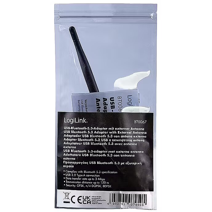 Description - The LogiLink USB BT 5.3 adapter with external antenna supports latency-free and loss-free sound quality with lower power consumption compared to BT 5.0. video files with an impressive range of up to 150 metres. This adapter is ideal for those who need a powerful and reliable Bluetooth connection.