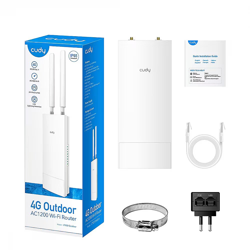 Apraksts - Maršrutētājs LT500 Āra LTE FDD/TDD Cat 4 AC1200 Wi-Fi 1 x 10/100 Mbps WAN/LAN Nano SIM slots 24 V pasīvais PoE 2 x iekšējās WiFi antenas + 2 x noņemamās 4G antenas VPN un DDNS IP65 Ūdensnecaurlaidīgs Pārvērtiet 4G visur par ātru AC1200 Wi-Fi ar 4G Cat. 4 standartiem LT500 Outdoor sazinās ar 4G torni ar ātrumu līdz 150 Mb/s lejupielādes un 50 Mb/s augšupielādes ātrumā. Ar MU-MIMO un divjoslu funkcijām AC1200 Wi-Fi dalās ātrajā 4G ar vairāk nekā 30 ierīcēm, vienlaikus samazinot kavēšanos. Palielināts Wi-Fi pārklājums ar Beamforming Testēta Wi-Fi pārklājuma veiktspēja četros dažādos scenārijos, kas sasniegta ar Beamforming tehnoloģiju un divām iebūvētām antenām. Ja jūsu telpa ir pārāk liela, lai to varētu aptvert ar vienu Cudy 4G āra maršrutētāju, varat paplašināt Wi-Fi pārklājumu Mesh tīklā, pievienojot vēl vienu Cudy AP. Ievietojiet SIM karti un izbaudiet Wi-Fi Wi-Fi Wi-Fi ierīkošana jebkurā vietā ir tikpat vienkārša kā SIM kartes pievienošana un palaišana ar PoE adapteri. Viens PoE adapteris ir iekļauts iepakojumā. Izvelciet tīklu līdz 100 m attālumā Pievienojiet Ethernet kabeli PoE adapterim/komutatoram, lai iegūtu līdz pat 100 m vadu tīkla sasniedzamību. Papildu kabelis nav iekļauts komplektācijā. Uzstādiet piekļuves punktu iekštelpu Wi-Fi Savienojiet piekļuves punktu ar PoE adapteri, lai aprīkotu savu kafejnīcu, māju vai okeānu ar labāku Wi-Fi signālu. AP jāiegādājas atsevišķi. Uzstādiet pagarinājuma antenas Noklusējuma 4G antenas ir tikpat jutīgas kā standarta tālruņa antenas. Tomēr varat tās aizstāt ar pielāgotām, izmantojot SMA savienotājus.