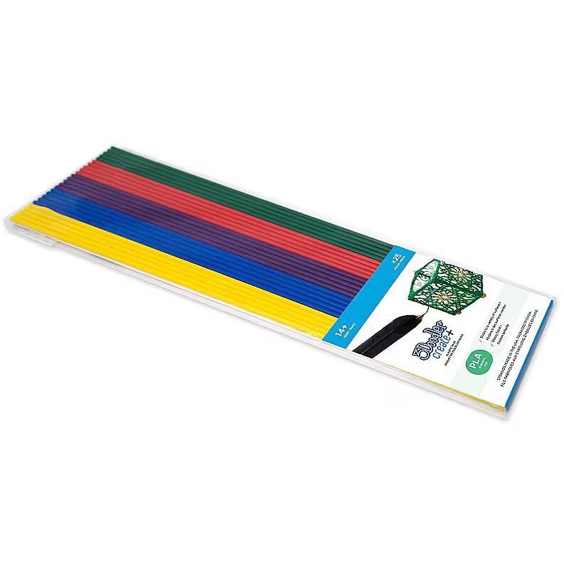 LongDesc - Spare cartridges for the 3Doodler are a must-have to ensure the continued satisfaction of the 3D pen and the fun it guarantees to its owners. The set includes 25 pieces of additional PLA cartridges, 5 cartridges of each color: Rubber Ducky Yellow (Yellow), Royal Blue (Blue), Perfectly Purple (Violet), Chili Pepper Red (Red), RainForest Green (Green).Characteristics of PLA cartridges- Features: Eco-friendly and glossy, perfect for art creations- How to recognize: Very stiff to bend, uniform end capsRecommended settings- 3Doodler Create - Temperature: LO, LED: Green- 3Doodler PRO - Temperature: 180-190stC, Speed: 3-6Technical data- Insert length: 254mm- Cartridge diameter: 3mm- Length of a single element after remelting: 2.5 m- Package dimensions: 275 x 87 x 4mm- Package weight: 52g- Compatibility: 3Doodler Pro, 3Doodler Create Plus, 3Doodler Create, 3Doodler 2.0, 3Doodler 1.0- The inserts are not compatible with the 3Doodler Start version3Doodler is one of those fantastic ideas that seem so obvious in retrospect that it is hard to believe that they are only now being implemented.The premise is simple: the pen draws with molten filament, which makes it possible to build 3D objects in the same way as a 3D printer, but without creating computer models.The 3Doodler pen is extremely easy to use. To start creative fun, just put the selected filament color in the guide and after a while you can start creating. You are only limited by your ingenuity!Creating with 3D printing has never been so easy and fun !!!