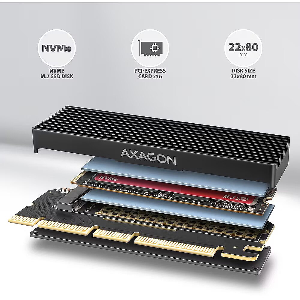 Description - PCEM2-XS PCIe NVMe M.2 adapter PCI-Express x16 adapter with cooler for connecting an NVMe M.2 SSD drive to a computer. The AXAGON PCEM2-XS internal adapter allows connecting an NVMe M.2 SSD disk to a desktop computer using a PCI-Express bus. Its high-quality workmanship, compact size, attractive design, and and sophisticated cooling make this adapter an ideal choice for upgrading a desktop computer not equipped with an M.2 slot. The adapter supports the use of single-sided and double-sided NVMe (PCI-Express) M.2 SSD drives. The reduction does not have a limit of SSD disk capacities and M.2 cards with dimensions of up to 22x80 mm can be used. Thanks to the PCI-Express interface, it is possible to achieve maximum transfer speeds. The LED indication indicates connection or data transfer in the M.2 slot. The adapter is equipped with a ribbed aluminum disc cover that serves as a passive heatsink. Thanks to the large cooling surface and supplied thermal pads, the cooler dissipates heat from both sides of the M.2 disk and thus achieves maximum cooling efficiency. This makes it ideal even for demanding PCIe 5.0 NVMe SSDs.