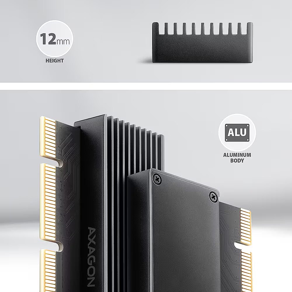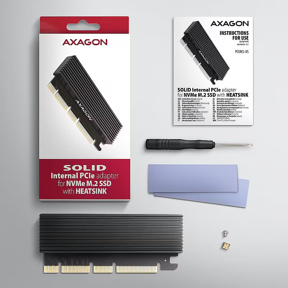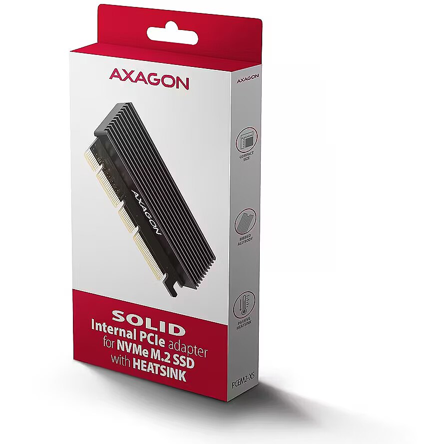 LongDesc - The AXAGON PCEM2-XS internal adapter allows connecting an NVMe M.2 SSD disk to a desktop computer using a PCI-Express bus. Its high-quality workmanship, compact size, attractive design, and and sophisticated cooling make this adapter an ideal choice for upgrading a desktop computer not equipped with an M.2 slot.The adapter supports the use of single-sided and double-sided NVMe (PCI-Express) M.2 SSD drives. The reduction does not have a limit of SSD disk capacities and M.2 cards with dimensions of up to 22x80 mm can be used.Thanks to the PCI-Express interface, it is possible to achieve maximum transfer speeds. The LED indication indicates connection or data transfer in the M.2 slot. The adapter is equipped with a ribbed aluminum disc cover that serves as a passive heatsink. Thanks to the large cooling surface and supplied thermal pads, the cooler dissipates heat from both sides of the M.2 disk and thus achieves maximum cooling efficiency. This makes it ideal even for demanding PCIe 5.0 NVMe SSDs.Input:• PCI-Express interface, compatible PCI-Express versions: 5.0 / 4.0 / 3.0 / 2.1 / 2.0 / 1.1 / 1.0a.• Number of 4-Lane lines, compatible with x4 / x8 / x16 PCIe slots.Output:• NGFF 75-pin M-key slot to install an NVMe (PCI-Express) M.2 SSD disk.Other features:• Full Plug and Play support.• Support of M.2 disks of these sizes – 2230, 2242, 2260, and 2280 mm.• Support of M key or B+M key NVMe (PCI-Express) M.2 SSD disks without a maximum capacity limit.• Support of both one-sided and double-sided M.2 disks.• Better heat dissipation due to the coppered vents, heat-conductive pads, and aluminium cooler.• Support of booting from an SSD card.• Dimensions: 105 x 45 x 12 mm. • Weight 50 g. • No drivers need to be installed. Power:• The adapter is powered directly from the PCI-Express bus, no external power supply required.Supported OS:• Windows, Linux.• Note: When Windows 7 is used, the support of this OS must be checked with the M.2 SSD disk manufacturer.Package contains:• PCIe adapter for M.2 NVMe (PCI-Express) SSD with aluminum heat sink,• thermal conductive pads,• mounting kit and screwdriver,• multilingual manual CZ / DE / DK / ENG / ESP / FIN / FR / GR / HR / HU / IT / NL / PL / PT / RO / RU / SK / SWE / TR / BG / CN / ARA,• packed in a cardboard box with a hanging hole.