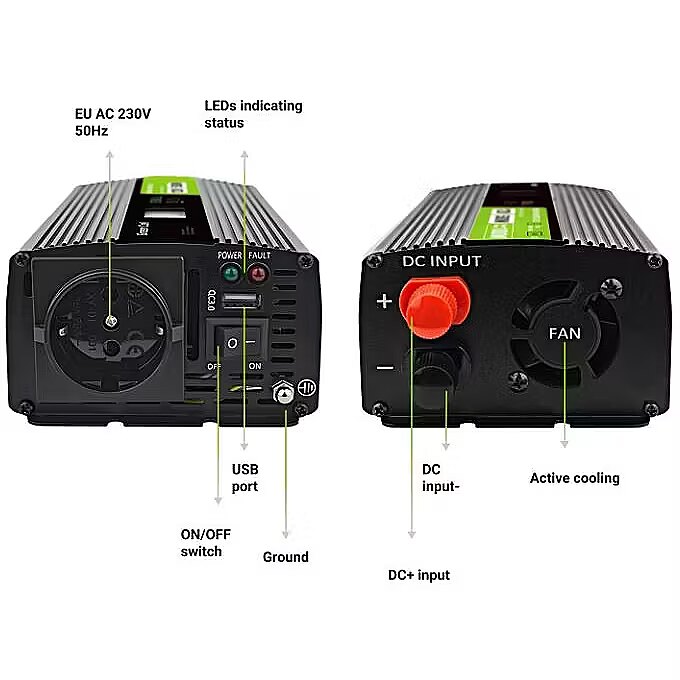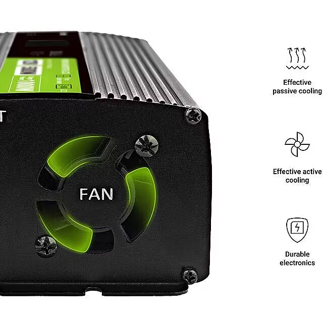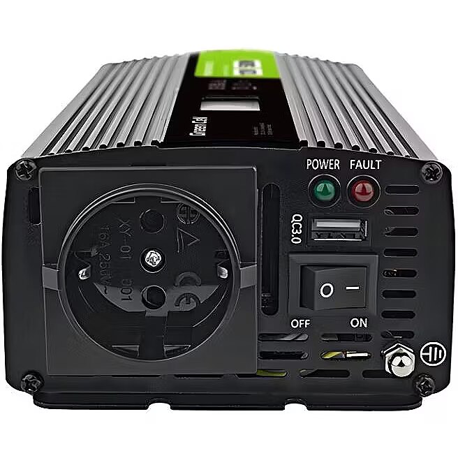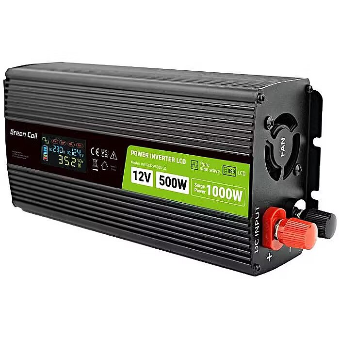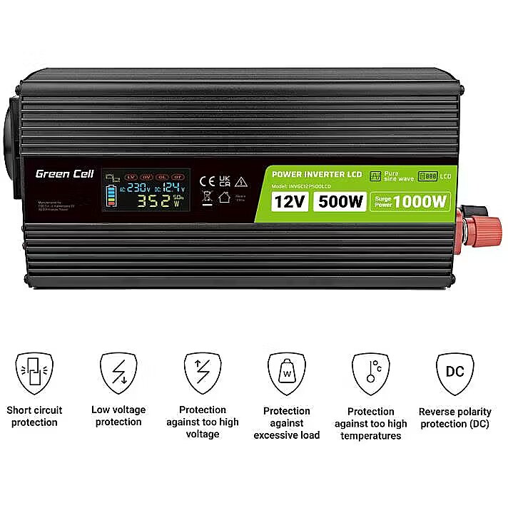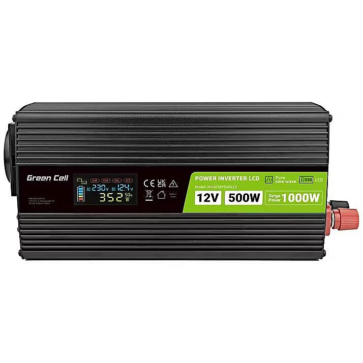 LargeDescHTML - Green Cell PowerInverter LCD 12 V 500 W/1000 W Pure sine wave inverter with display, intelligent protections and active cooling for long-lasting, trouble-free operationThe inverter produces AC 230 V and pure sinusoidal current, which is exactly the same as that available from an electrical socket suitable for all appliances including CO pumps, fridges with a generator or microwavesClear display showing key parameters, including current power and battery level, for easy and intuitive operationIntelligent protections which continuously monitor the operation of the device, such as protection against short circuits, low voltage, overvoltage, overload, overtemperature, reverse polarity (DC)