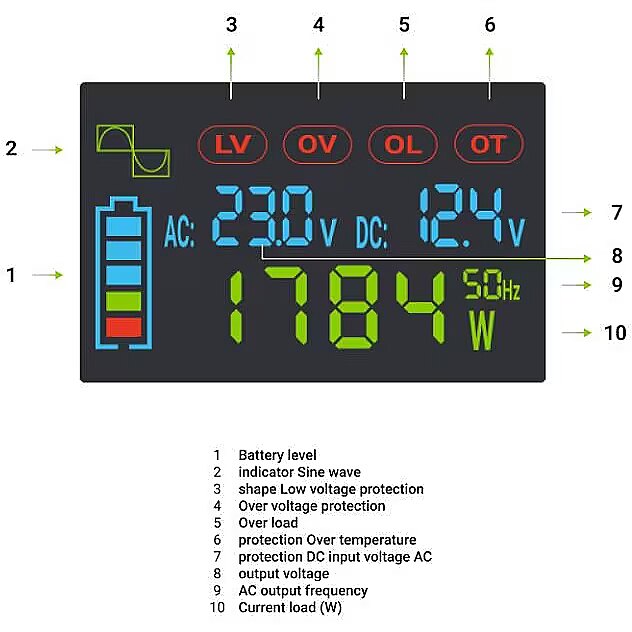 Description - Electrical socket always with you - even easier to use Connect the inverter to the battery, switch it on and use it! You will be able to track all key parameters including the estimated battery charge level on the easy-to-read display. Pure sine wave - simply. For all your devices! The 230 V inverter generates a full (otherwise pure) sine wave output current. This means that the current is the same as that found in a 230 V household "socket", so it can be used safely with any electrical equipment. The inverter with LCD display is all about the benefits. It shows the current state of charge of the battery and informs you of the pure sine wave. This allows you to plan your work precisely and prevent over-discharge or overload of the battery.