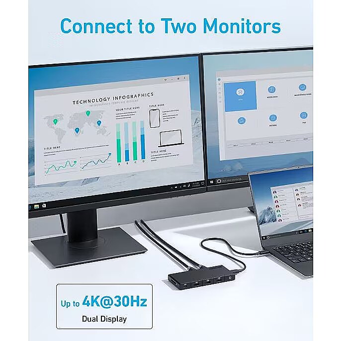 LongDesc - The Essential Hub for Office ConnectivityMassive ExpansionExpand your laptop's functionality with a total of 10 ports, allowing you to connect to multiple monitors, transfer files at high speed, enjoy pass-through charging, and more.Connect to Two MonitorsConnect to both HDMI ports to view content on two monitors at a resolution of up to 4K@30Hz, making it easier to multitask across several apps.Flexible PlacementComes with a 1.6 ft (0.5 m) cable so you can easily move the hub around your desk to find the most convenient place for you.