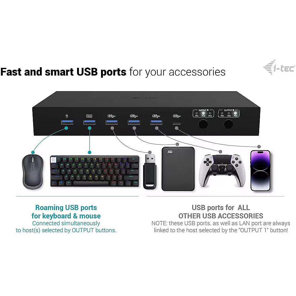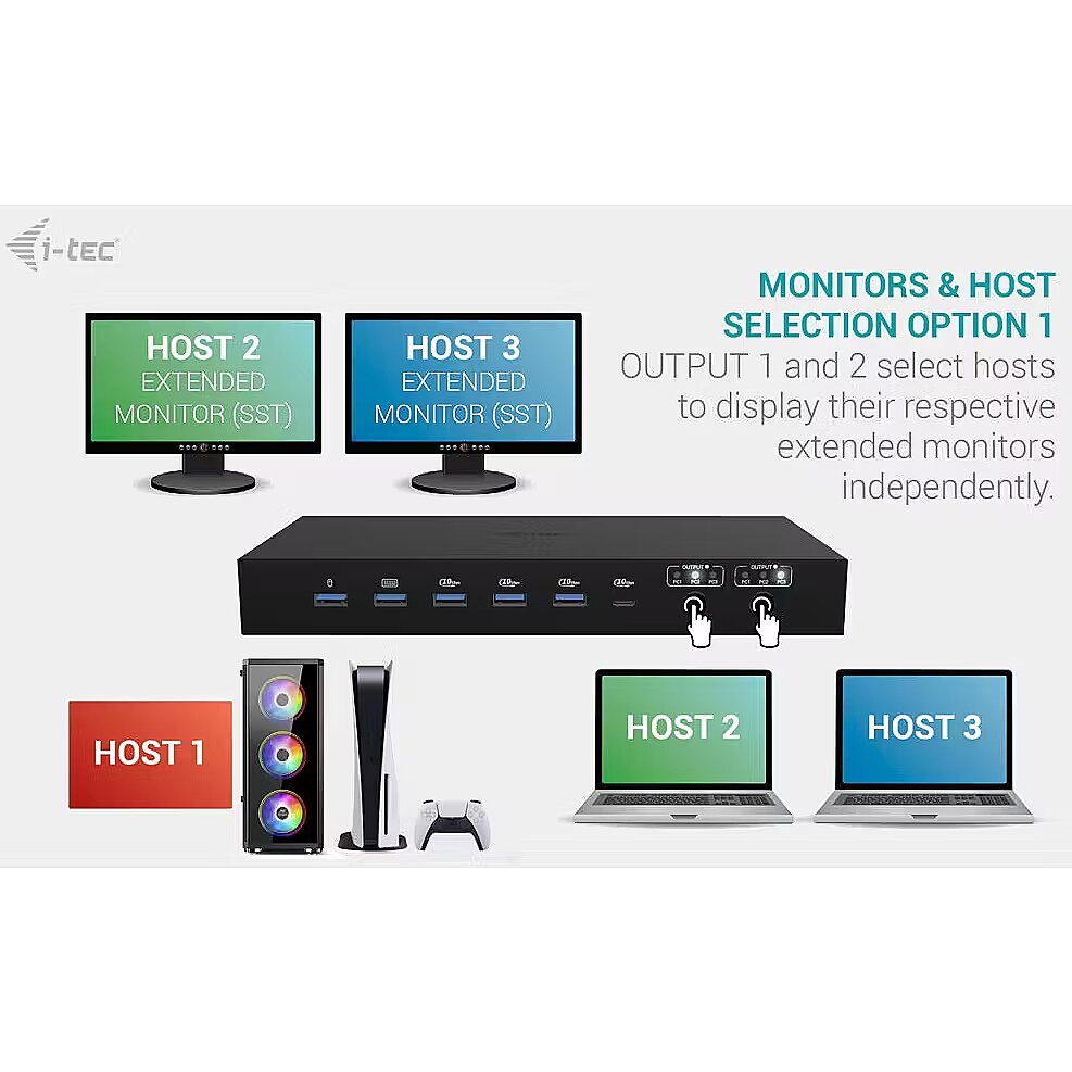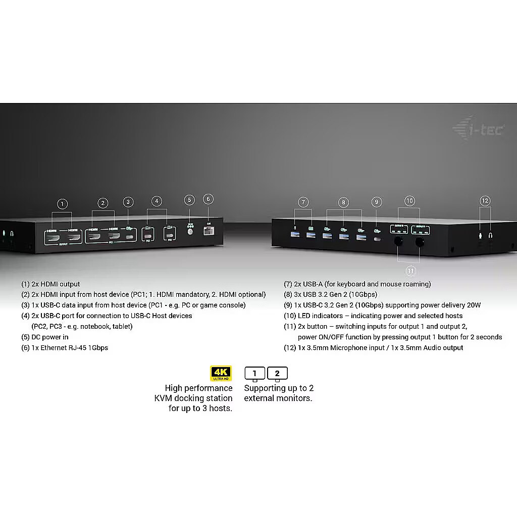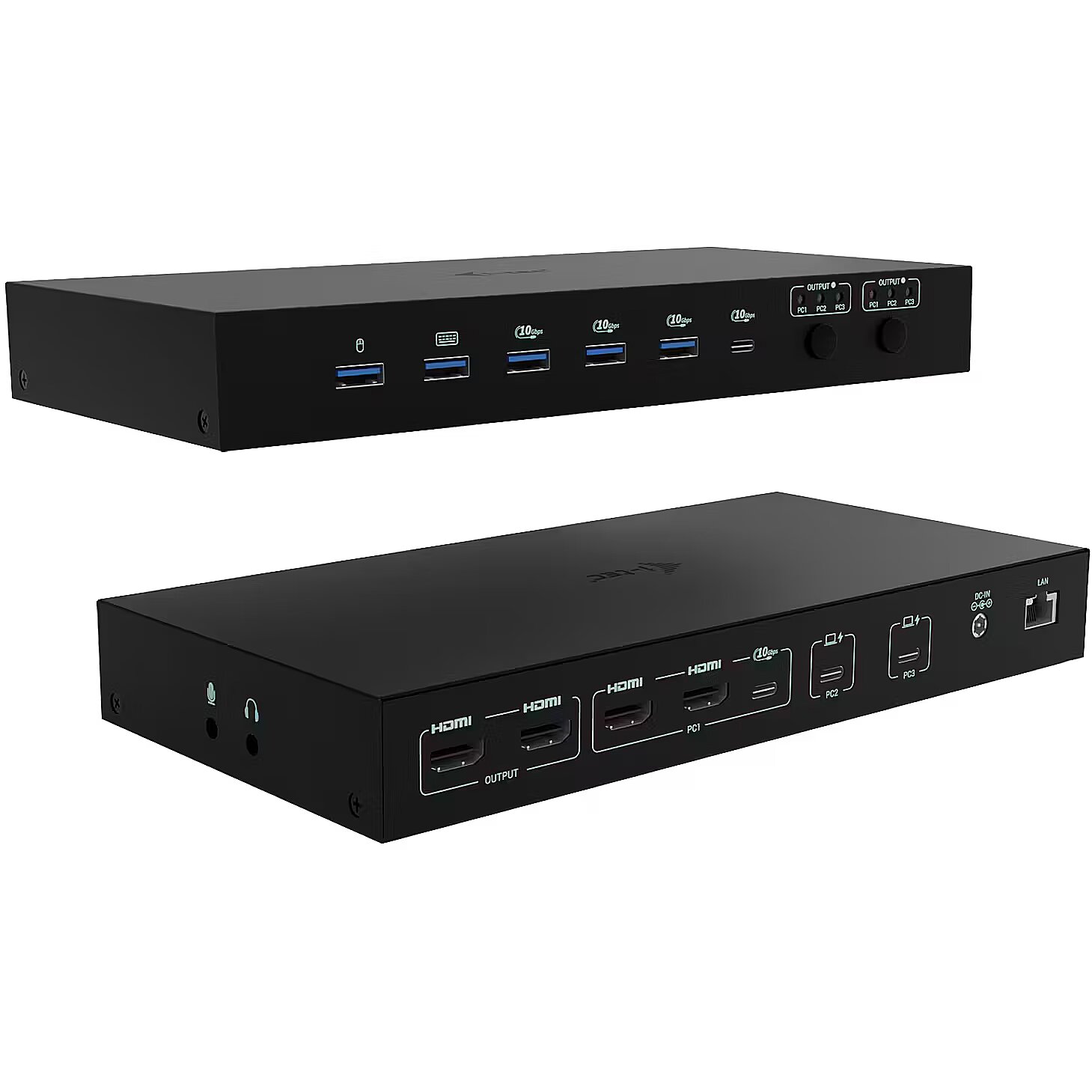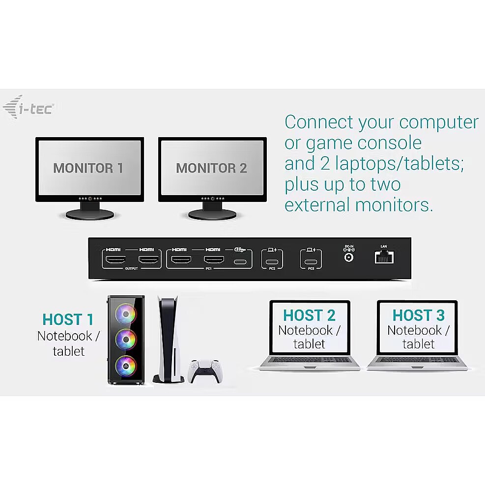 LongDesc - Premium KVM Docking Station for Up to Three DevicesThis high-performance docking station allows simultaneous connection of up to three host devices – one PC or game console and two notebooks or tablets. Fully compatible with devices featuring USB-C, USB4, or Thunderbolt 3/4/5 ports. PCs or consoles can be connected via HDMI and USB.It supports up to two external monitors, which can either display content from a single host or each from a different one – ideal for multitasking or working across multiple systems.Thanks to two USB roaming ports, you can seamlessly share your keyboard and mouse between two hosts at once, boosting comfort and productivity.The station also features four high-speed USB ports (10 Gbps) for your peripherals, along with full connectivity including GLAN, audio, and microphone ports.Intelligent power delivery supports up to 92W charging for a single laptop, or 45W each when powering two devices simultaneously.With convenient output selectors, you can easily choose whether both monitors mirror a single host or operate independently across two – ideal for parallel workflows.- Support for up to 3 external host devices (2x laptop/tablet and 1x game console/PC)- Connect up to 2 external monitors with up to 4K/60 Hz resolution *- 2 smart USB ports for keyboard and mouse with roaming (shared) function- 4 fast USB ports with 10 Gbps speed (3 USB-A and 1 USB-C, which can also charge up to 15W)- LAN port with speeds up to 1Gbps (10/100/1000 Mbit)- 2x 3.5mm ports for audio and microphone- Power supply 1x 92W or 2x 45W- 2x independent OUTPUT buttons for selecting the host device (OUTPUT 1 button also serves as the docking station power switch) * macOS does not support Multi-Stream Transport (MST) for multi-display video output. As a result, when using macOS, the same image will be mirrored on both connected monitors.