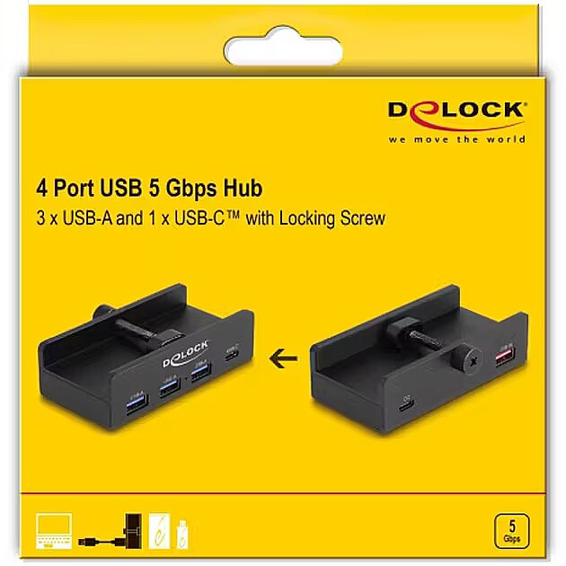 Name - DeLOCK External USB 5 Gbps 4 Port Hub 3 x USB Type-A and 1 x USB Type-C™ with locking screw, USB Hub black
