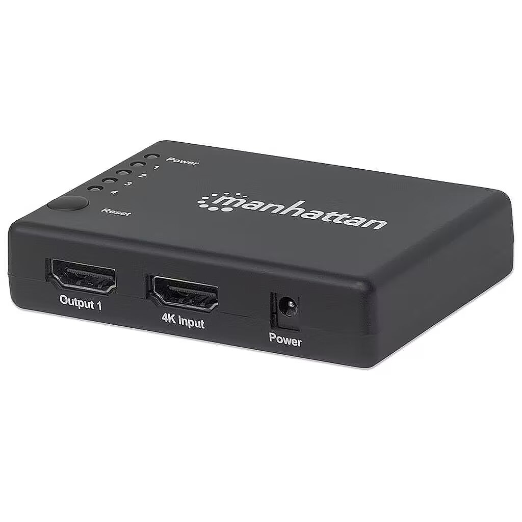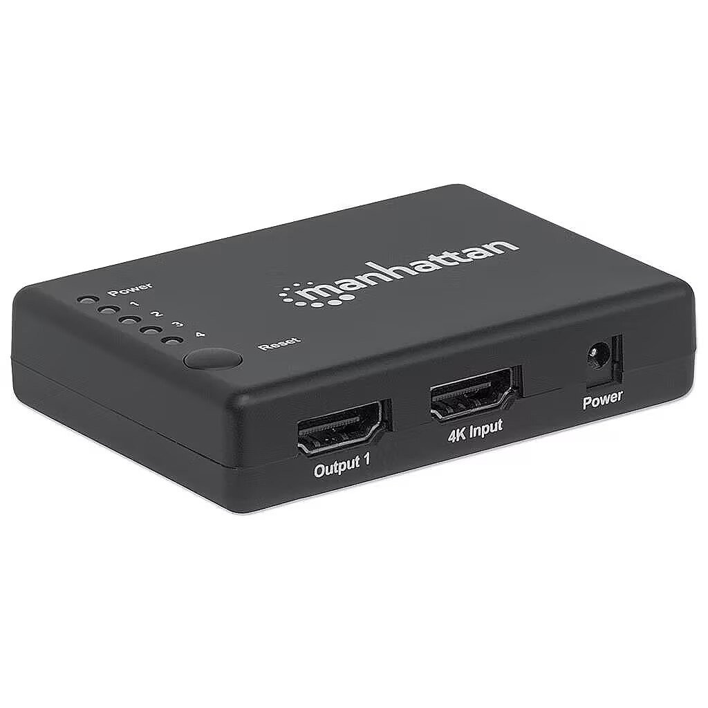 Title - Manhattan HDMI Splitter 4-Port (Compact), 4K@30Hz, Displays output from x1 HDMI source to x4 HD displays (same output to four displays), AC Powered (cable 0.7m), Black, Three Year Warranty