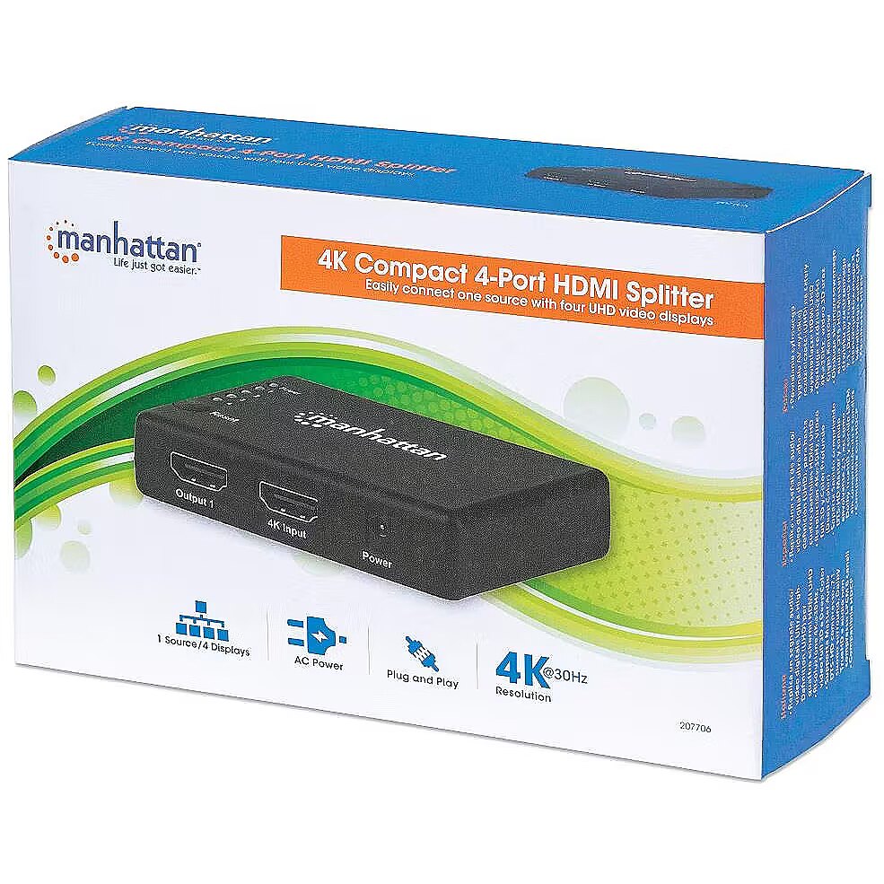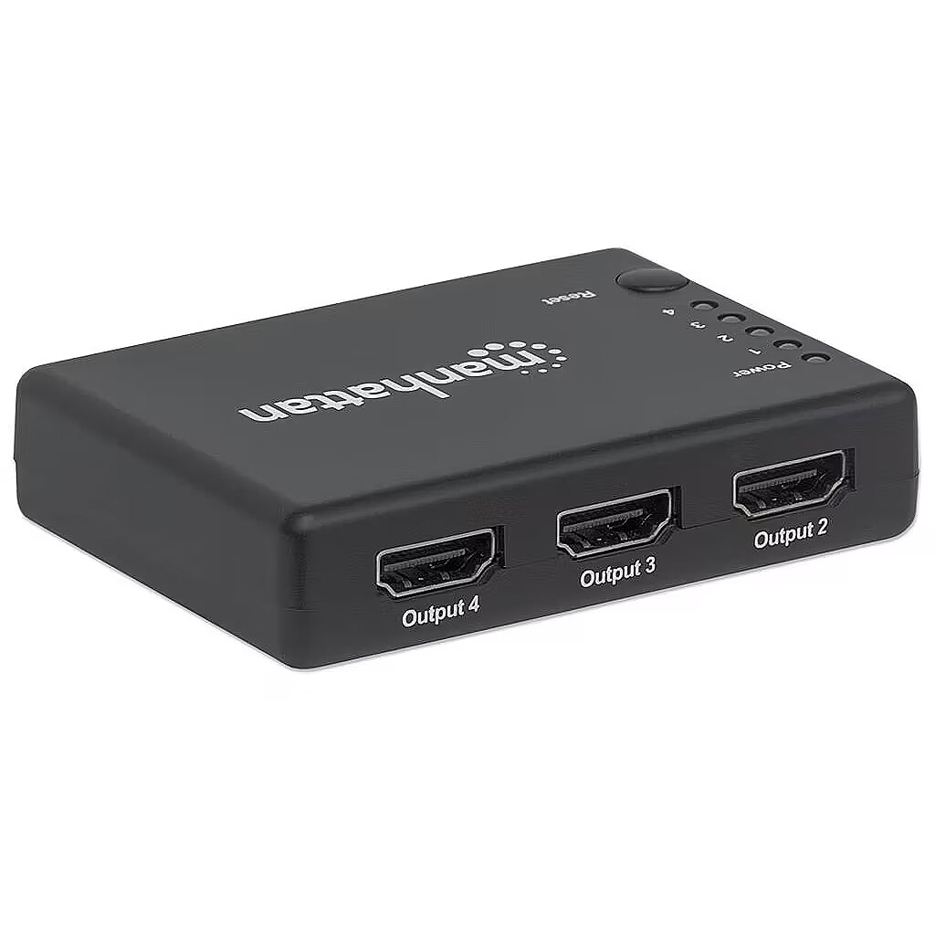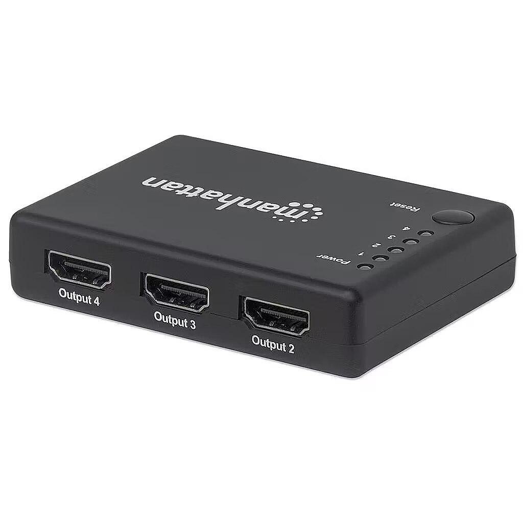 ShortSummaryDescription - Manhattan HDMI Splitter 4-Port (Compact), 4K@30Hz, Displays output from x1 HDMI source to x4 HD displays (same output to four displays), AC Powered (cable 0.7m), Black, Three Year Warranty, HDMI, 4x HDMI, 4096 x 2160 pixels, Black, Plastic, 15 m