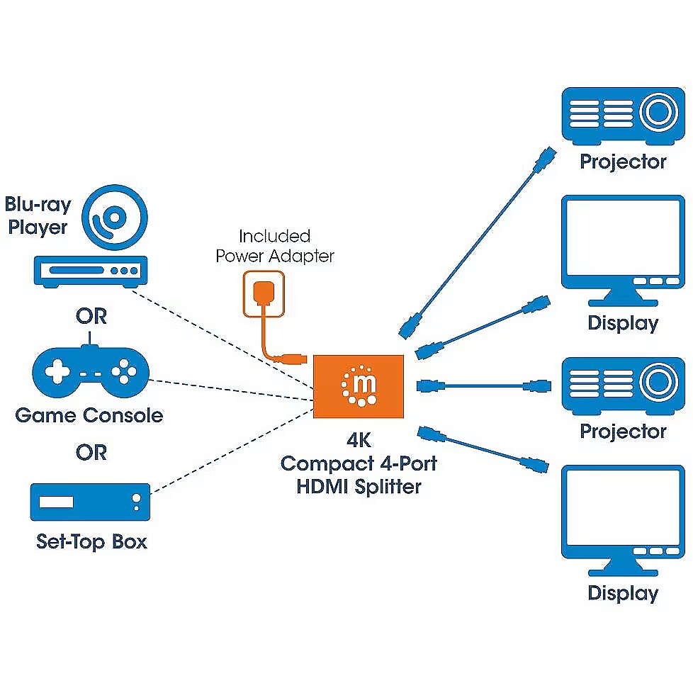 LongDesc - Easily distribute a single Ultra-High-Definition (UHD) signal to multiple displays.The Manhattan 4K 4-Port HDMI Splitter with built-in booster streams a 4K HDMI signal from a single UHD source to up to four UHD displays.Best Possible Image Quality and Easy InstallationFull compliance with HDMI and HDCP 1.4 ensures the Manhattan 4K 4-Port HDMI Splitter provides nothing short of high-quality performance and reliability. It delivers cinematic 4K resolution and supports 3D video, Deep colour, as well as LPCM, DTS and Dolby TrueHD audio. Quickly connect HDMI cables (not included) and the power supply to complete this cost-effective 4K solution - no software or hardware configuration or complicated settings required.