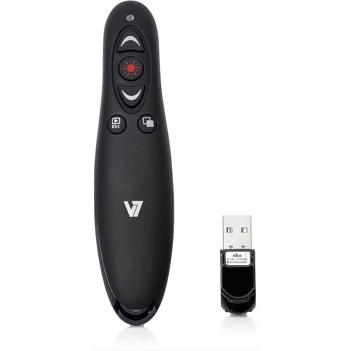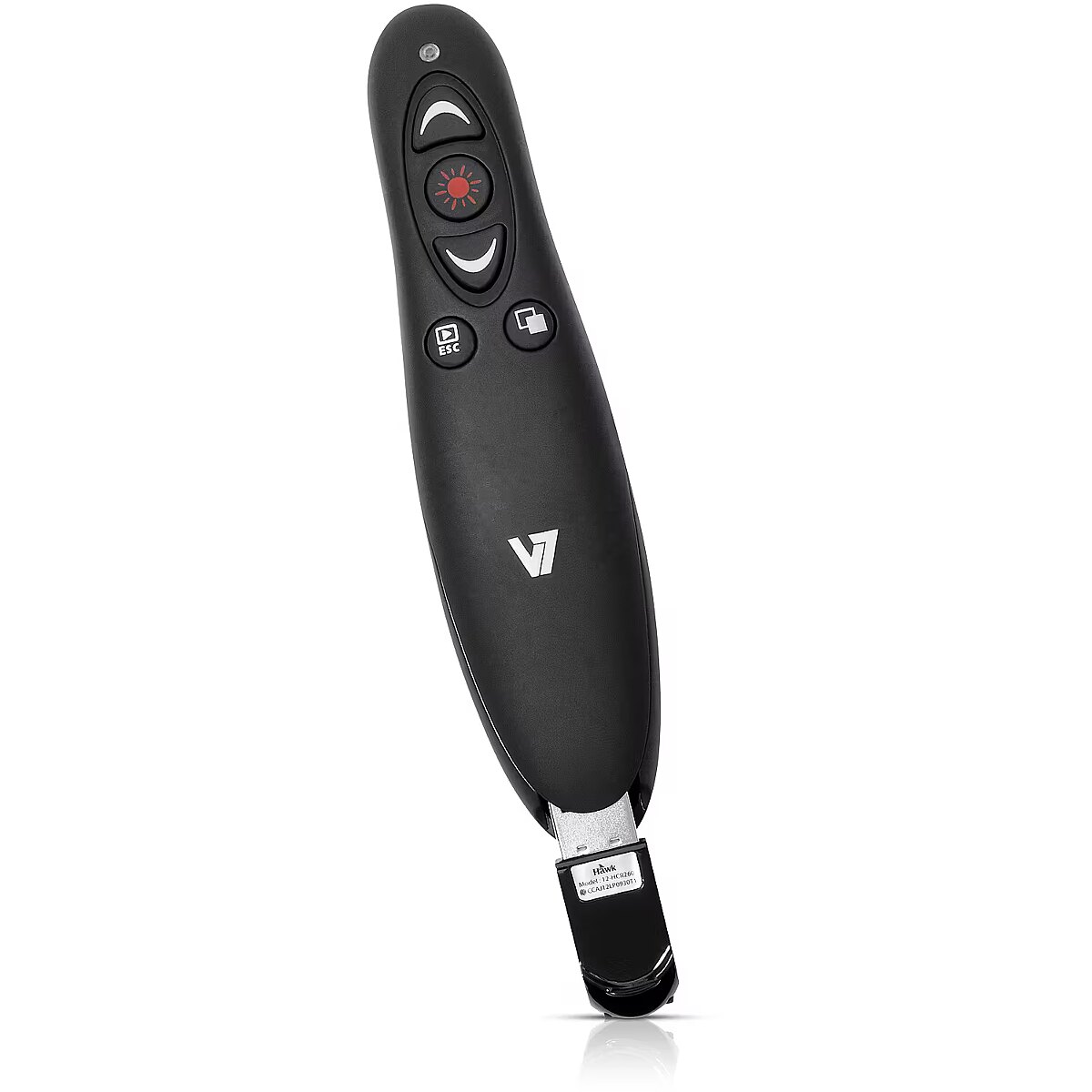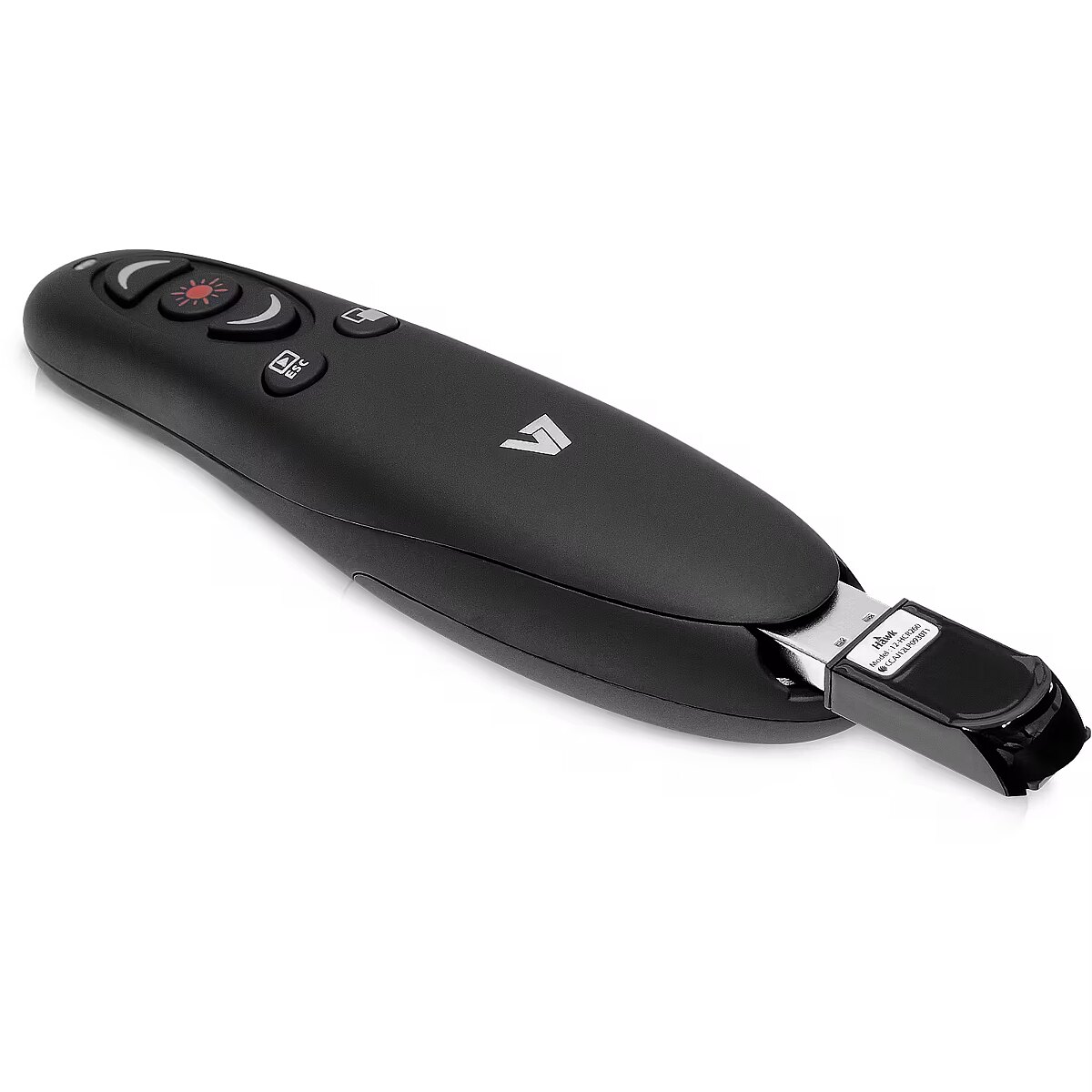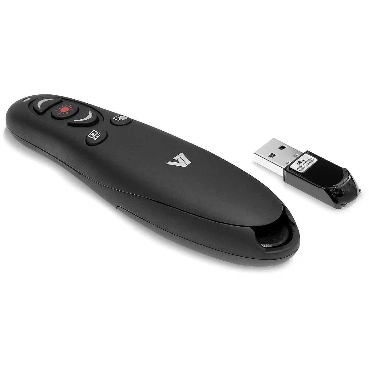 LongDesc - Control your next presentation with the V7 professional wireless presenter. Its ergonomic design with soft-touch finish fits comfortably in the palm of your hand and provides 5 control buttons (Page Up, Page Down, Screen Blackout, Play/Exit, Laser) to effortlessly navigate through your presentation. The high performance red laser pointer lets you emphasize key points to your audience. Use the Micro SD card reader that is integrated in self-storing USB Nano receiver to upload presentations on the fly.-Ergonomic design with soft-touch finish, fits comfortably in the palm of your hand-2.4 GHz secure wireless connection with up to 35 feet range-5 control buttons (Page Up, Page Down, Screen Blackout, Play/Exit, Laser)-High performance red laser pointer-Micro SD card reader integrated in Self-storing USB Nano Receiver