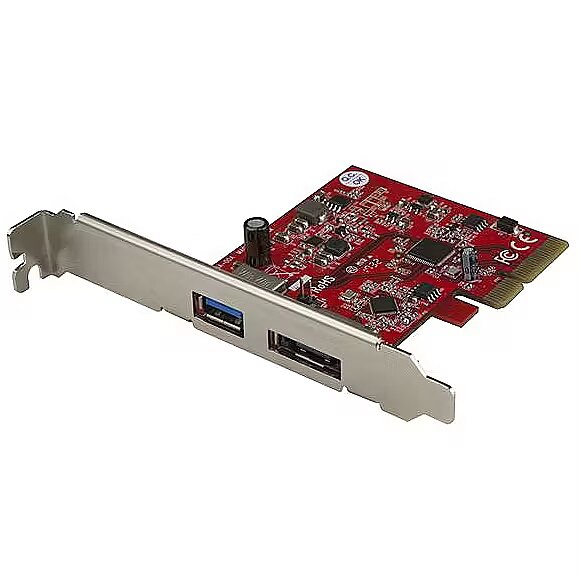 LongSummaryDescription - StarTech.com 2-Port USB 3.1 (10Gbps) and eSATA PCIe Card - 1x USB-A and 1x eSATA. Host interface: PCIe, Output interface: eSATA, Expansion card standard: PCIe 3.0. Product colour: Red, Certification: CE, FCC, TAA, REACH. Chipset: ASMedia - ASM2142, ASMedia - ASM1351, Data transfer rate (max): 10 Gbit/s. Windows operating systems supported: Windows 10, Windows 10 Education, Windows 10 Education x64, Windows 10 Enterprise, Windows 10..., Server operating systems supported: Windows Server 2012, Windows Server 2016, Windows Server 2019. Width: 80 mm, Depth: 93 mm, Height: 100 mm