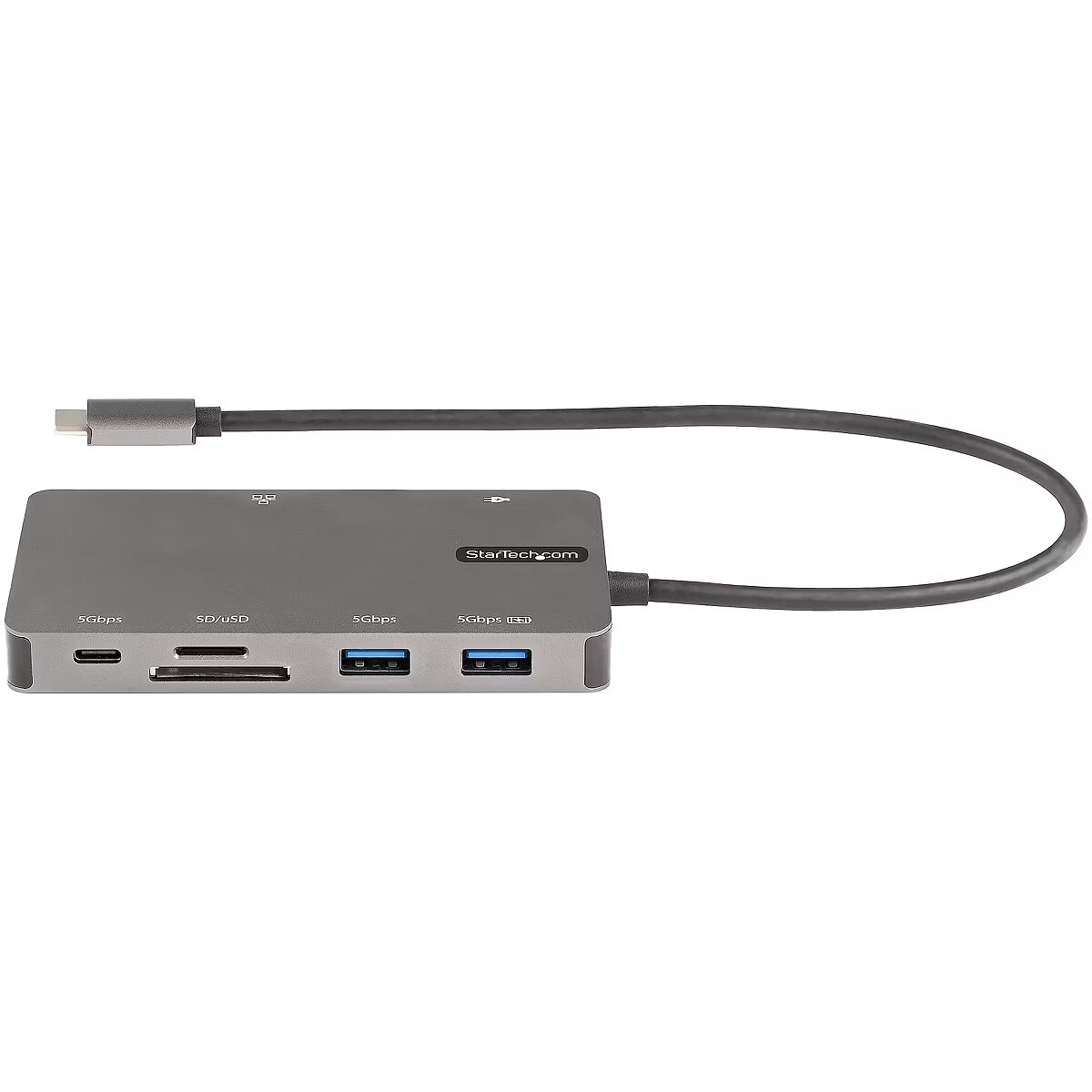 LongSummaryDescription - StarTech.com USB C Multiport Adapter - HDMI 4K 30Hz or VGA Travel Dock - 5Gbps USB 3.0 Hub (USB A / USB C Ports) - 100W Power Delivery - SD/Micro SD - GbE - 30cm Cable - USB C Mini Dock. Connectivity technology: Wired, Host interface: USB 3.2 Gen 1 (3.1 Gen 1) Type-C, USB Power Delivery up to: 100 W. Ethernet LAN data rates: 10,100,1000 Mbit/s, Networking standards: IEEE 802.3, IEEE 802.3ab, IEEE 802.3u. Product colour: Grey, Compatible memory cards: MicroSD (TransFlash), SD, SDHC, SDXC, Data transfer rate: 5 Gbit/s. Power consumption (typical): 15 W. Windows operating systems supported: Windows 7 Ultimate x64, Windows 10, Windows 7 x64, Windows 10 Education, Windows 8, Windows 10..., Mac operating systems supported: Mac OS X 10.10 Yosemite, Mac OS X 10.11 El Capitan, Mac OS X 10.12 Sierra, Mac OS X 10.14 Mojave,..., Other operating systems supported: ChromeOS