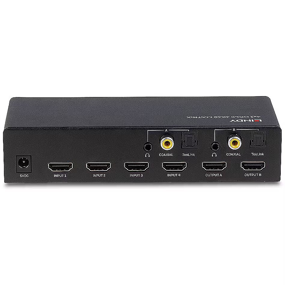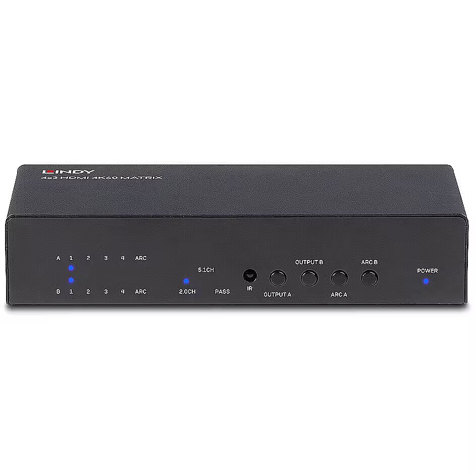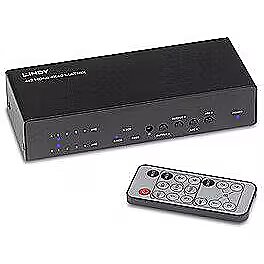 LongDesc - Switches between 4 HDMI source devices and 2 HDMI displays connected simultaneouslySupports resolutions up to 4K 60Hz, with additional support for HDRExtract audio from HDMI to Toslink (Optical) and 3.5mm audioSupports ARC as well as a Downscaler-Function via HDMI Out B2 year warrantyPlease note that two versions of this item exist with different connectors.Please refer to the manuals to find out which version you have.The Lindy 4x2 HDMI 4K60 Matrix Switch is a high performance solution for distributing content from multiple source devices to two displays.Supporting HDMI 2.0 18G signals, this matrix allows for the transmission of clear 4K Ultra HD 60Hz resolutions, while additional support for High Dynamic Range ensures video content can be seen with enhanced brightness, greater contrasts and a much wider colour gamut, perfect for digital signage displays in retail or hospitality or creating engaging educational setups. HDCP 2.2 support ensures there are no issues with a variety of 4K content when connected to source devices including set top boxes, Blu-Ray players and 4K HDR media players.As well as HDMI audio pass-through, a 3.5mm audio port allows for a separate connection of both analogue speaker systems, and optical audio devices such as soundbars and amplifiers, for creating immersive audio experiences to compliment the video on screen.This matrix can be easily controlled via push button switching on the unit, while the included remote control also allows the user to have better control over multiple videos and displays, great for trade shows, training presentations or sales demonstrations.