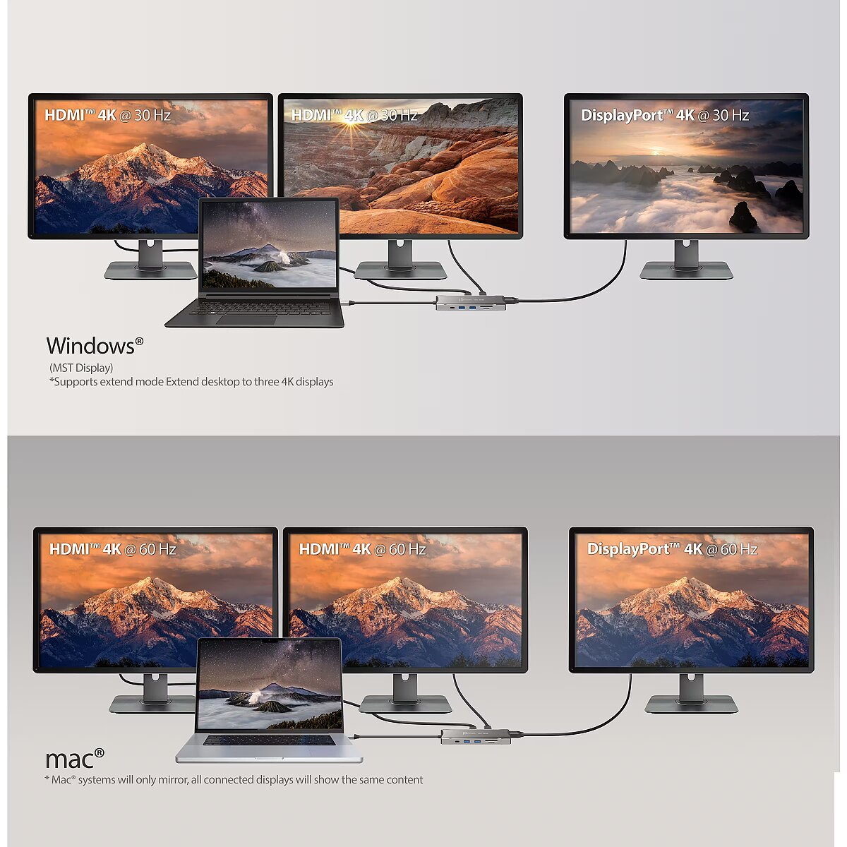 LongDesc - Equipped with an advanced USB-C® E-Mark chip, this multi-monitor mini dock is compatible with USB4™ hosts and devices, featuring everything you need, from triple video outputs to 10Gbps USB™ ports, as well as 100W Power Delivery pass-through charging.This USB-C® mini dock supports DisplayPort™ 1.4 and Multi-Stream Transport (MST), giving you the ability to create a dual or triple 4K workstation with two HDMI™ and a DisplayPort™ output. It provides three USB™ SuperSpeed 10 Gbps ports (2 USB-C® and 1 USB™ Type-A) for peripheral connectivity or downstream charging, an SD™ & microSD™ 4.0 memory card reader/writer to manage your media files, and a Gigabit Ethernet port to access a wired network. It also supports Power Delivery 3.0, providing up to 100W pass-through charging to power the connected peripherals and charge your host laptop with a USB-C® power adapter.