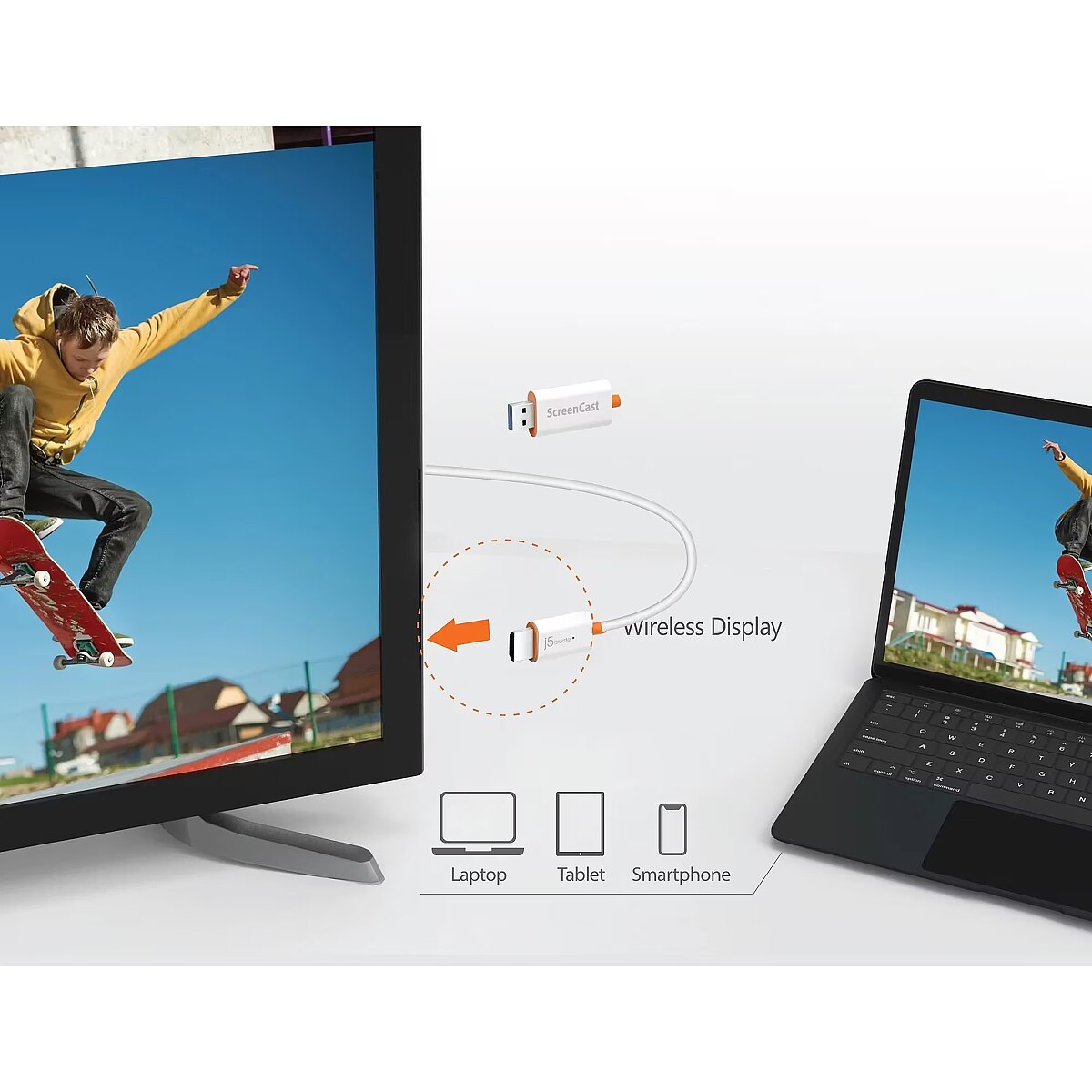LongDesc - "Wirelessly display content from a phone, tablet, or laptop onto a bigger screen with the ScreenCast Wireless Display Adapter. With its support of multiple wireless display standards (Miracast™, AirPlay®, and Chromecast™), this wireless display adapter is compatible with devices and TVs you already own, including Windows®, macOS®, iOS®, iPadOS®, and Android™ operating systems.Perfect for home, travel, office, and more. The ScreenCast works with a wide variety of apps. Just connect and share!"