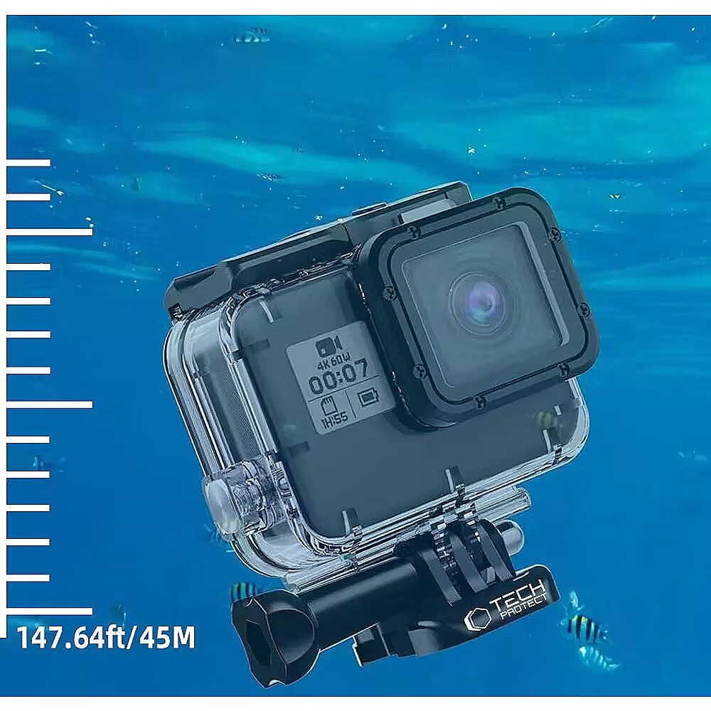 description_en - Meet the Tech-Protect GA200 Waterproof Case – a waterproof case for your GoPro Hero camera that will provide reliable protection for your camera in the harshest conditions! Made from impact-resistant polycarbonate, it effectively protects against mechanical damage while remaining lightweight and comfortable to use.Meets the highest waterproof standards, allowing immersion to a depth of up to 45 metres, as confirmed by IP certification. This is the only case you'll need for extreme travel – whether you're diving, surfing or exploring mountain trails. You'll also find a mounting adapter and mounting screw to securely attach your camera. The Tech-Protect GA200 is a reliable companion for any adventure, allowing you to record unforgettable moments without limits! Made from impact-resistant polycarbonate Fully watertight up to 45 metres Lightweight and compact design