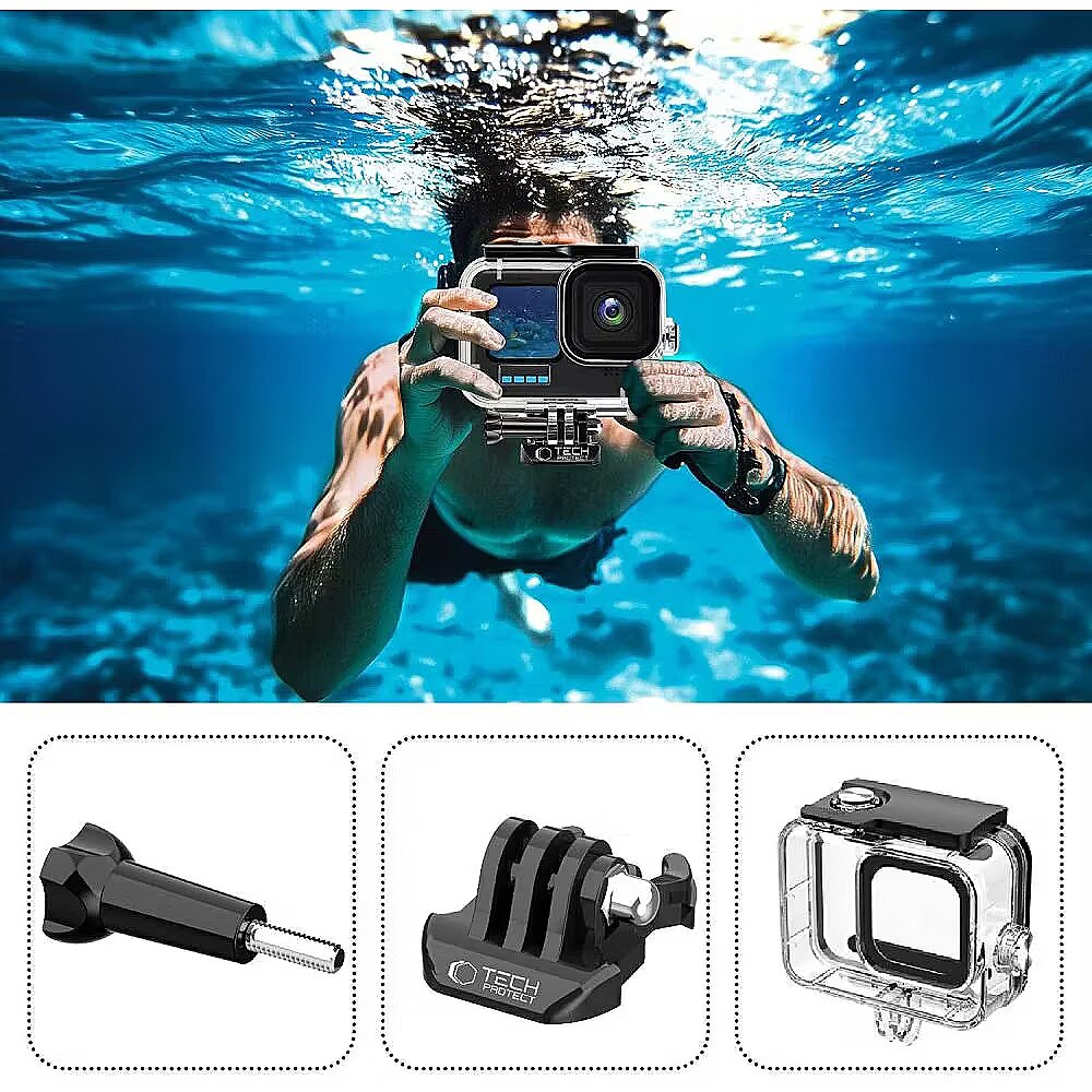 description_en - Meet the Tech-Protect GA200 Waterproof Case – a waterproof case for your GoPro Hero camera that will provide reliable protection for your camera in the harshest conditions! Made from impact-resistant polycarbonate, it effectively protects against mechanical damage while remaining lightweight and comfortable to use.Meets the highest waterproof standards, allowing immersion to a depth of up to 45 metres, as confirmed by IP certification. This is the only case you'll need for extreme travel – whether you're diving, surfing or exploring mountain trails. You'll also find a mounting adapter and mounting screw to securely attach your camera. The Tech-Protect GA200 is a reliable companion for any adventure, allowing you to record unforgettable moments without limits! Made from impact-resistant polycarbonate Fully watertight up to 45 metres Lightweight and compact design