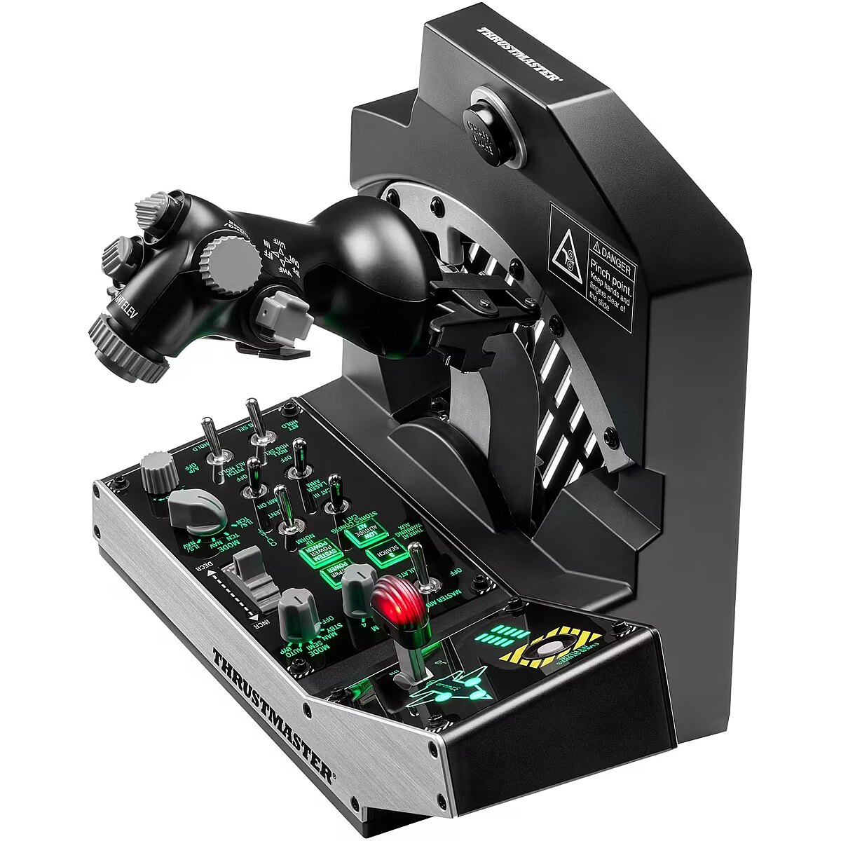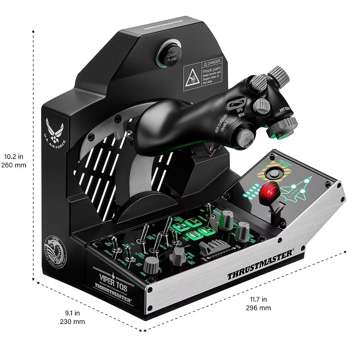 LongDesc - n a nutshellA legend returns with Viper TQS, the famous throttle quadrant system from the Viper, officially licensed by the U.S. Air Force and compatible with PC. Take your cockpit to the next level of performance and experience outstanding ergonomics with a 1:1 scale replica featuring metal handle casing and buttons, plus realistic and iconic control switches. Viper TQS replicates the realistic controls, flight kinematics and sensations experienced by real Viper pilots.UNDER THE HOODOFFICIAL REPLICA OF THE VIPER TQSTake your cockpit to the next level of performance with the U.S. Air Force Viper TQS (Throttle Quadrant System) for PC. Experience outstanding ergonomics with a 1:1 scale replica featuring metal handle casing and buttons from the legendary Viper.LEGENDARY FLIGHT KINEMATICSEnjoy faithful replication of the Viper throttle’s mechanical movement along its axis, with thrilling and smooth travel thanks to metal bearings. Viper TQS reproduces the real feeling with its legacy axis rail with access to Idle/Cutoff and Afterburner detents, via mechanical levers and handle rotation. It’s also easy to switch to a 100% linear axis.ICONIC DOGFIGHT FUNCTIONSViper TQS provides you with real-world sensations via features such as metal control knobs, a Chaff/Flare slap switch to deploy countermeasures in air combat, and blackout switches for better immersion in your dogfights.ADJUSTABLE FRICTIONEnjoy firm, linear travel with no dead zones on the throttle thanks to the adjustable friction. Die-cast metal construction ensures constant friction that won’t decrease over time, with 16-bit surgical precision thanks to the H.E.A.R.T (HallEffect AccuRate Technology) magnetic sensor.VERSATILE AND VR-READYKeep your enemies in your line of sight! Each of the 21 action buttons is easy to access — and easy to find, even if you’re wearing a VR headset. You can also take advantage of the VR switch, allowing you to zoom in your Point of View so that you never miss any of the action.SCALABLE THROTTLEUnleash the potential of Viper TQS by expanding its flight and combat capabilities with Viper Panel (sold separately) — a high-quality, backlit add-on module with 43 buttons (including 11 virtual ones), landing gear lever, and jettison function (for emergencies), as well as one trim wheel (axis).