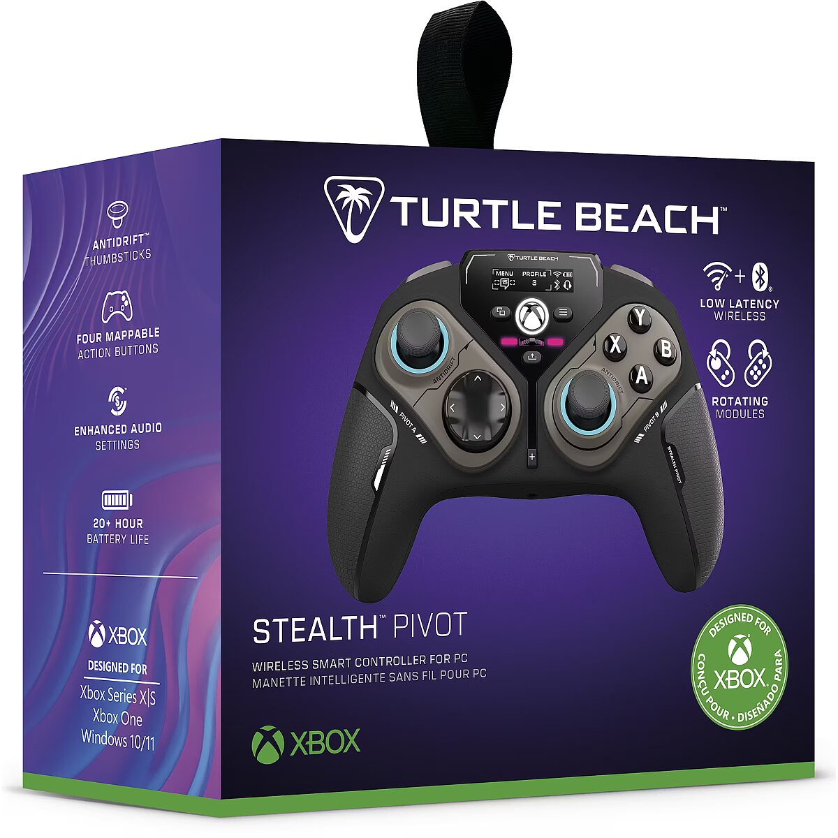 description_en - The Turtle Beach Stealth™ Pivot wireless smart controller is designed for revolutionary gameplay on Windows PCs. Stealth™ Pivot features rotating button modules to quickly switch between core button layouts designed for FPS, action & racing titles, or revolved layouts for fighter & retro games. Play wirelessly on PC with the 2.4 GHz wireless transmitter, or via Bluetooth® on Android devices & Smart TVs, and even play on Xbox consoles using the wired connection. A 20-hour battery life keeps you locked in without disruptions, plus the wired cable supports play-and-charge capability. The Connected Command Display screen offers extensive customization, and hall-effect thumbsticks, adjustable triggers and mappable buttons provide smooth, long-lasting, and adjustable control for multi-genre dominance. Lag-Free 2.4GHz Wireless Connection to PC Rotating Button Modules for Multi-Genre Dominance Connected Command Display for On-Board Social Notifications 20-Hour Battery Life + Play & Charge Capability AntiDrift™ Thumbsticks for Long-Lasting, Smooth Control Adjustable Trigger Stops & Precise, Customizable D-pad Four Mappable Quick-Action Buttons with Pro-Aim Quick-Slide Switch for In-Game Adjustments Control Center 2 app for audio & control customization Immersive, Adjustable Vibration Feedback High-Performance, Lag-Free Wireless For PC