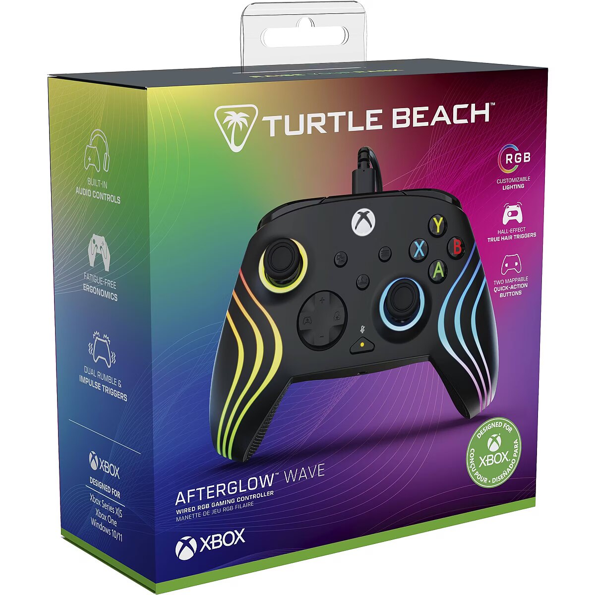 LongDesc - Unlock elevated gaming performance and style with the Turtle Beach® Afterglow™ Wave RGB gaming controller for Xbox Series X|S, Xbox One and Windows 10 & 11 PCs. Featuring Hall-Effect 3-stop adjustable triggers, you can fine-tune trigger sensitivity and enjoy smooth, precise, and durable control. Customize your controller’s style with intelligent RGB lighting, offering eight unique lighting zones and eight different preset modes with adjustable brightness. Customize your gameplay with two mappable quick-action buttons, keeping essential commands within close reach. Stay locked in with patented D-pad audio controls at your fingertips, allowing for instant adjustments to game/chat volume mix and master volume, plus a dedicated mic mute button. Download the Control Hub companion app for Xbox consoles & Windows PCs giving you advanced customization options for lighting, button mapping, as well as controller configuration and diagnosis. Dual rumble motors and impulse triggers provide immersive, responsive feedback, and an ergonomic shape with laser-etched textured grips ensures a fatigue-free feel. Officially licensed for Xbox and PC, the controller’s 10ft USB-C wired connection ensures reliable, lag-free gaming.