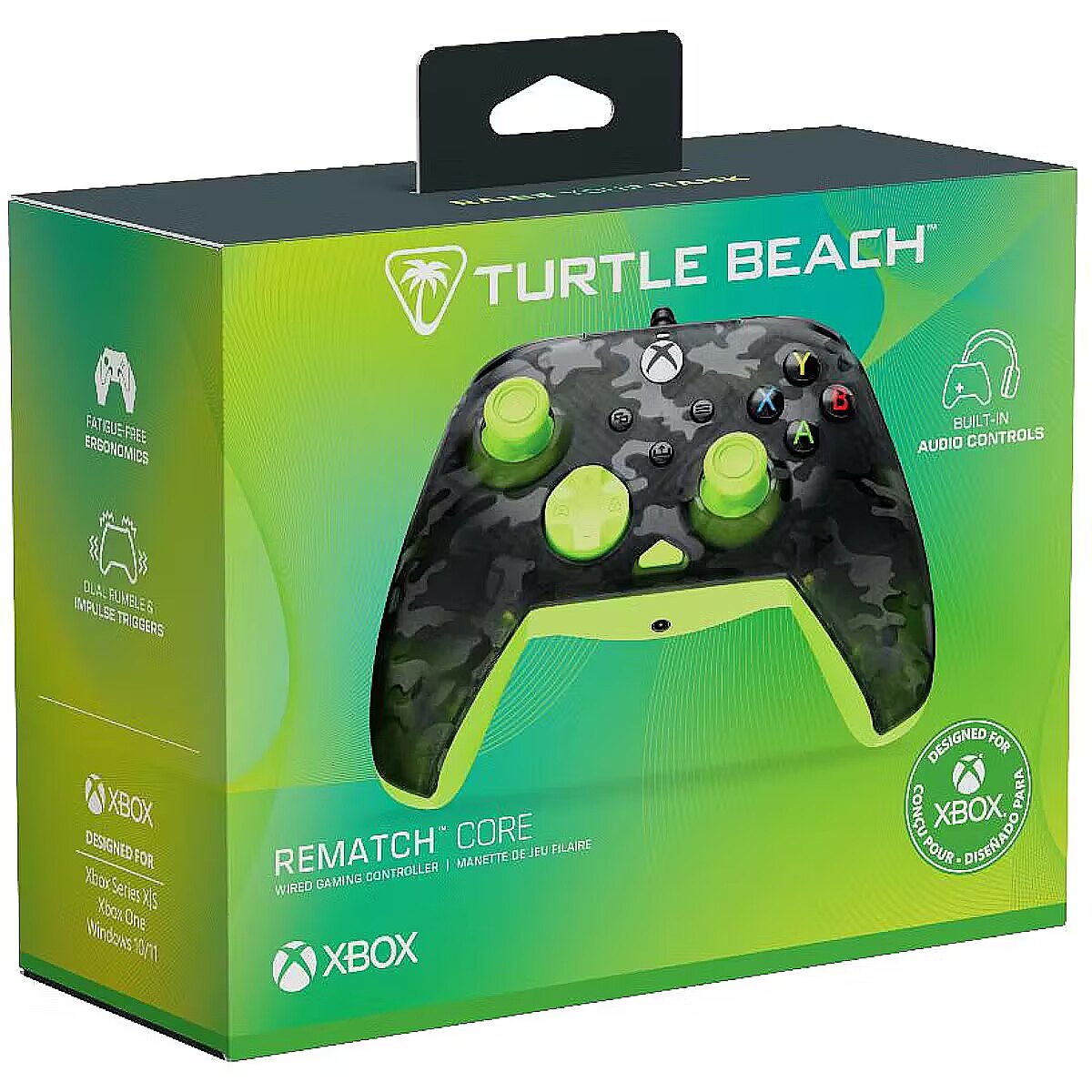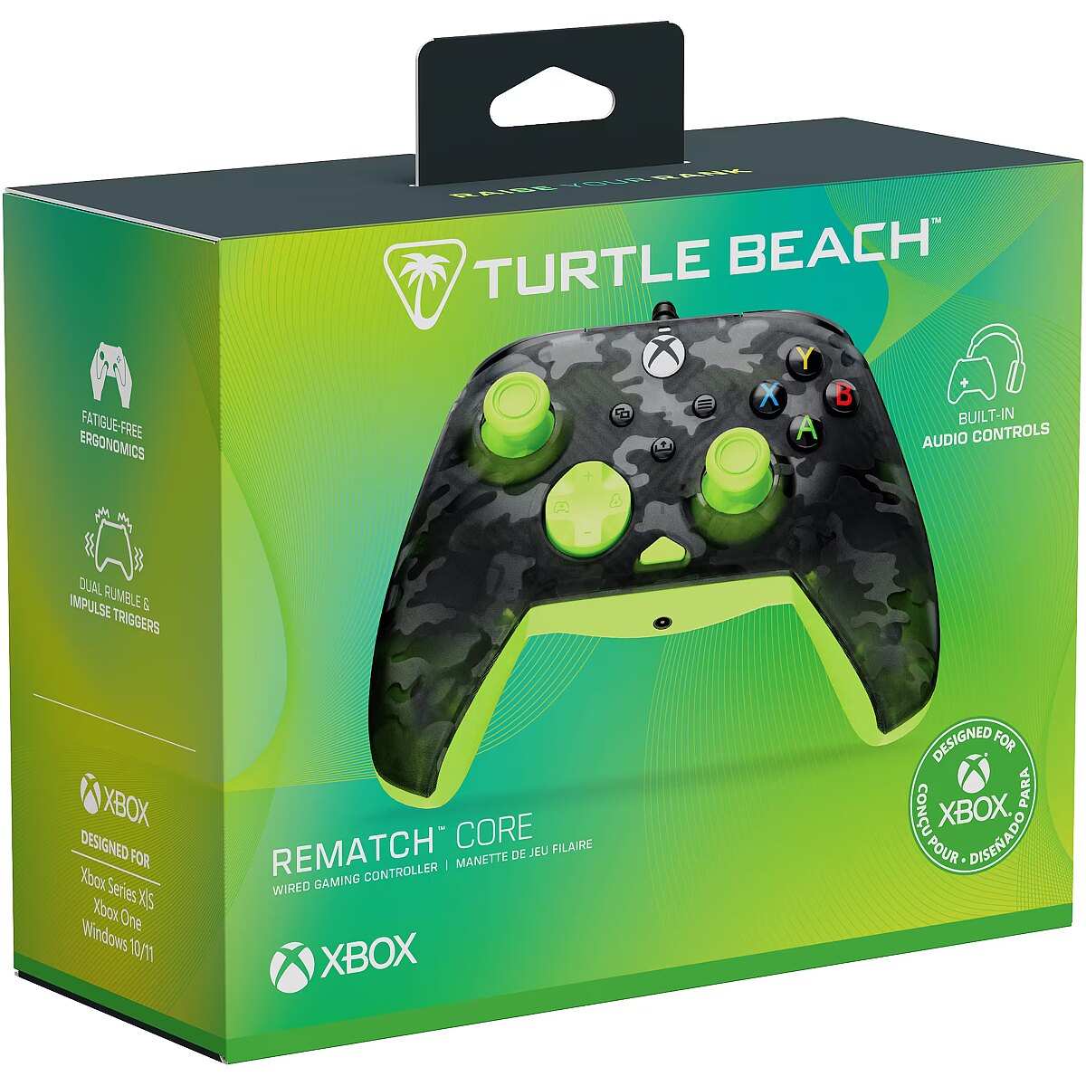 LongDesc - Experience game-enhancing control and precision with the Turtle Beach® Rematch™ Core wired controller, officially licensed for Xbox Series X|S, Xbox One, and Windows 10 & 11 PCs. Enjoy seamless audio adjustments on-the-fly with patented audio controls integrated in the D-pad, including game/chat mix and master volume, plus a dedicated mic mute button. Designed for comfort, the ergonomic shape ensures a fatigue-free grip during extended gaming sessions. Dual rumble motors and impulse triggers deliver responsive and immersive feedback for enhanced gameplay. Officially licensed for Xbox and PC, the Rematch™ Core Controller is equipped with a reliable 8ft USB-C connection for uninterrupted gaming on Xbox Series X|S, Xbox One, and Windows 10/11 PCs. For quick and easy controller configuration and diagnosis, download the Control Hub companion app, available on Xbox consoles and Windows PCs.