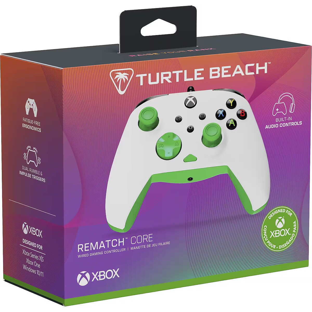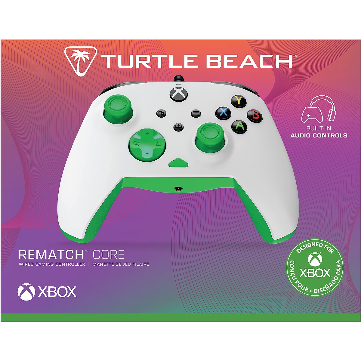 LongDesc - Experience game-enhancing control and precision with the Turtle Beach® Rematch™ Core wired controller, officially licensed for Xbox Series X|S, Xbox One, and Windows 10 & 11 PCs. Enjoy seamless audio adjustments on-the-fly with patented audio controls integrated in the D-pad, including game/chat mix and master volume, plus a dedicated mic mute button. Designed for comfort, the ergonomic shape ensures a fatigue-free grip during extended gaming sessions. Dual rumble motors and impulse triggers deliver responsive and immersive feedback for enhanced gameplay. Officially licensed for Xbox and PC, the Rematch™ Core Controller is equipped with a reliable 8ft USB-C connection for uninterrupted gaming on Xbox Series X|S, Xbox One, and Windows 10/11 PCs. For quick and easy controller configuration and diagnosis, download the Control Hub companion app, available on Xbox consoles and Windows PCs.