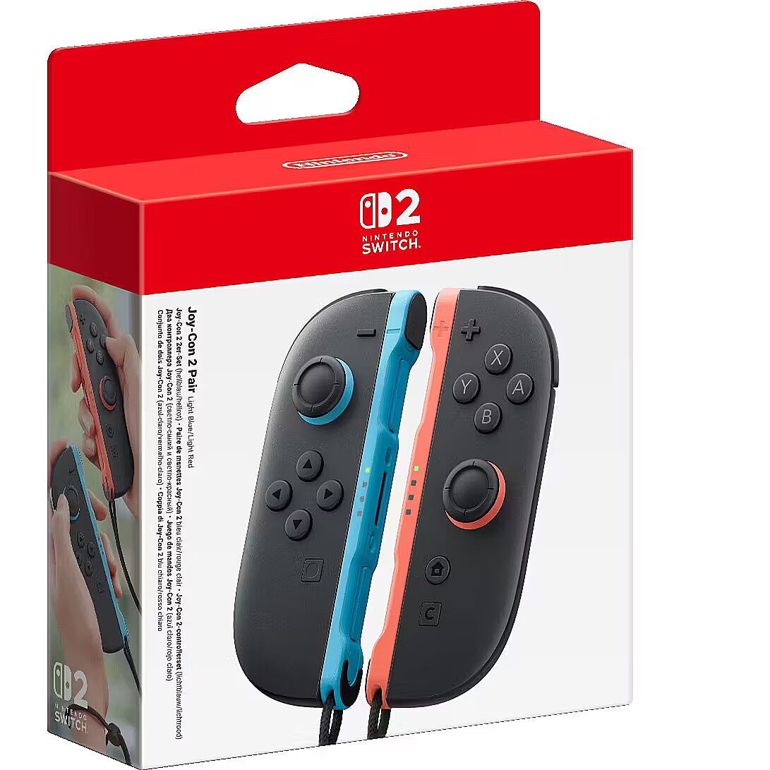 LongSummaryDescription - Nintendo Joy-Con 2 (L)/(R) Light Blue/Light Red. Device type: Joystick, Gaming platforms supported: Nintendo Switch 2, Gaming control function buttons: Capture button, D-pad, Home button. Connectivity technology: Wireless, Device interface: Bluetooth. Product colour: Black, Blue, Red. Power source: Battery, Battery type: Built-in, Battery technology: Lithium-Ion (Li-Ion). Width: 14.4 mm, Depth: 30.7 mm, Height: 116 mm
